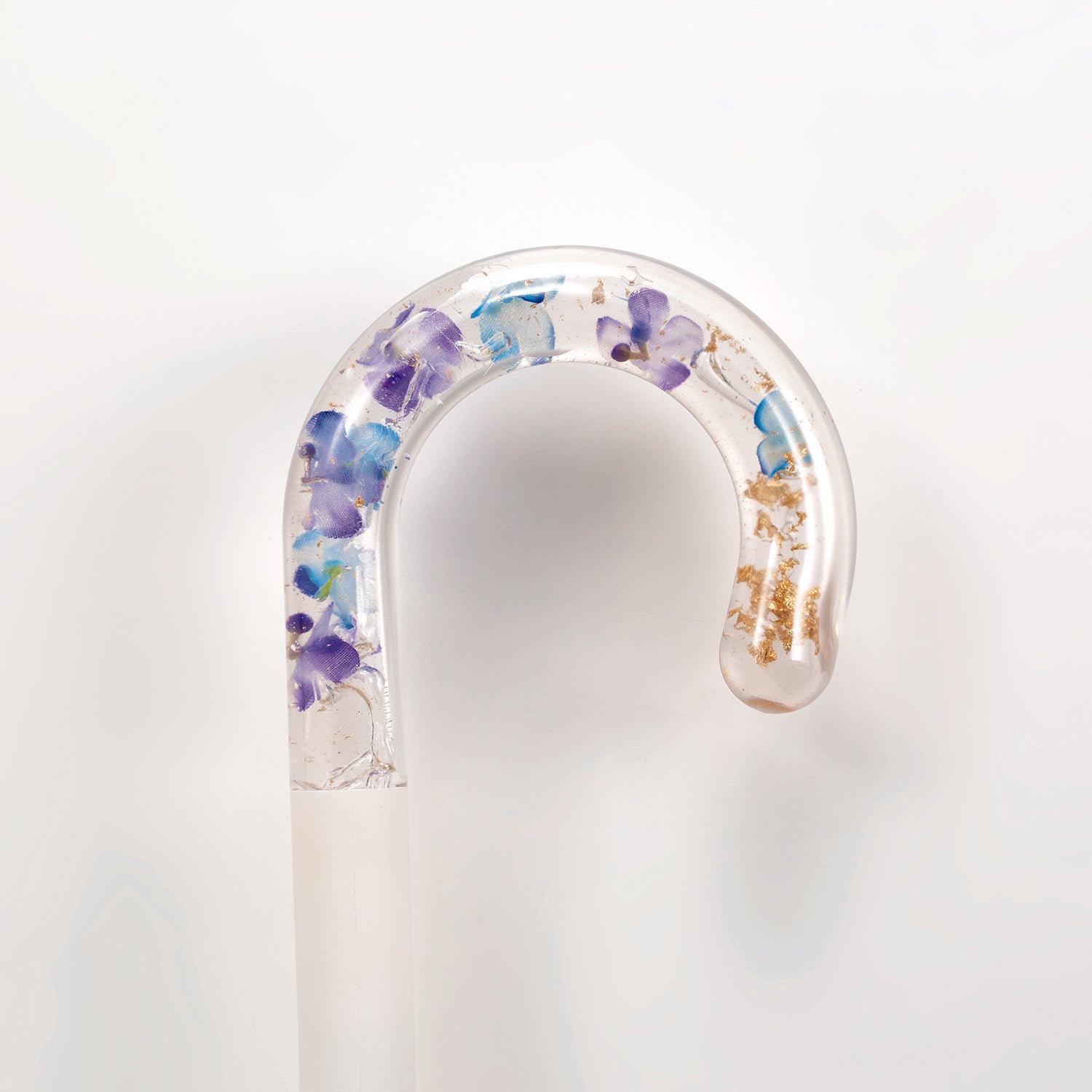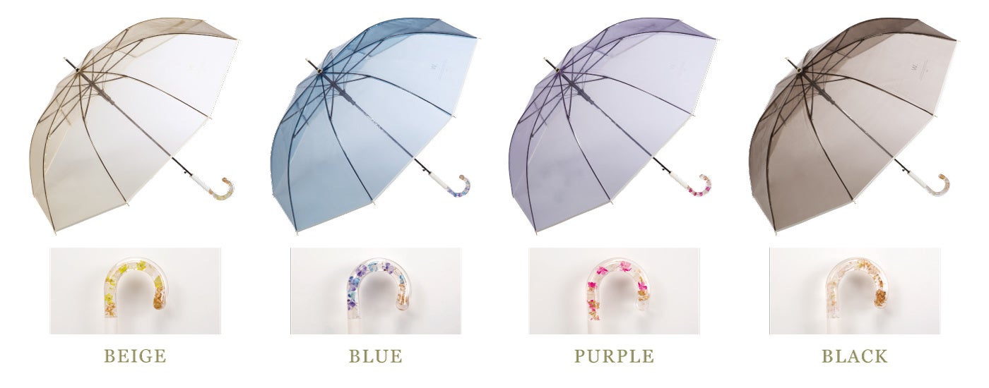 またハンドルは1本ずつ丁寧に手作りされており、花びらやゴールド色の箔、気泡の入り方はそれぞれ異なるので、唯一無二の風合いや癒やしを感じられるのもポイント。4色のハンドルにはベージュ、ブルー、パープル、ブラックのカラービニール生地を合わせることで、トレンド感がアップし、大人っぽい抜け感もプラスします。