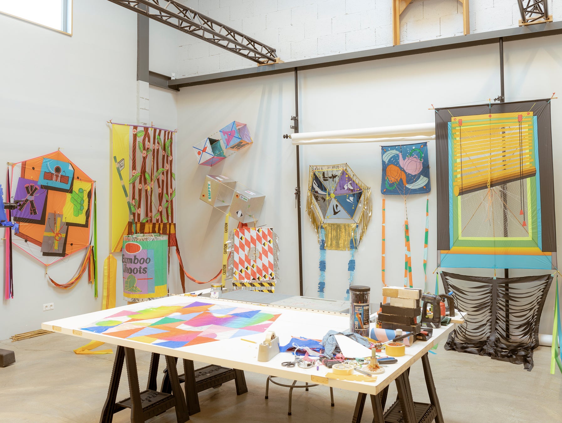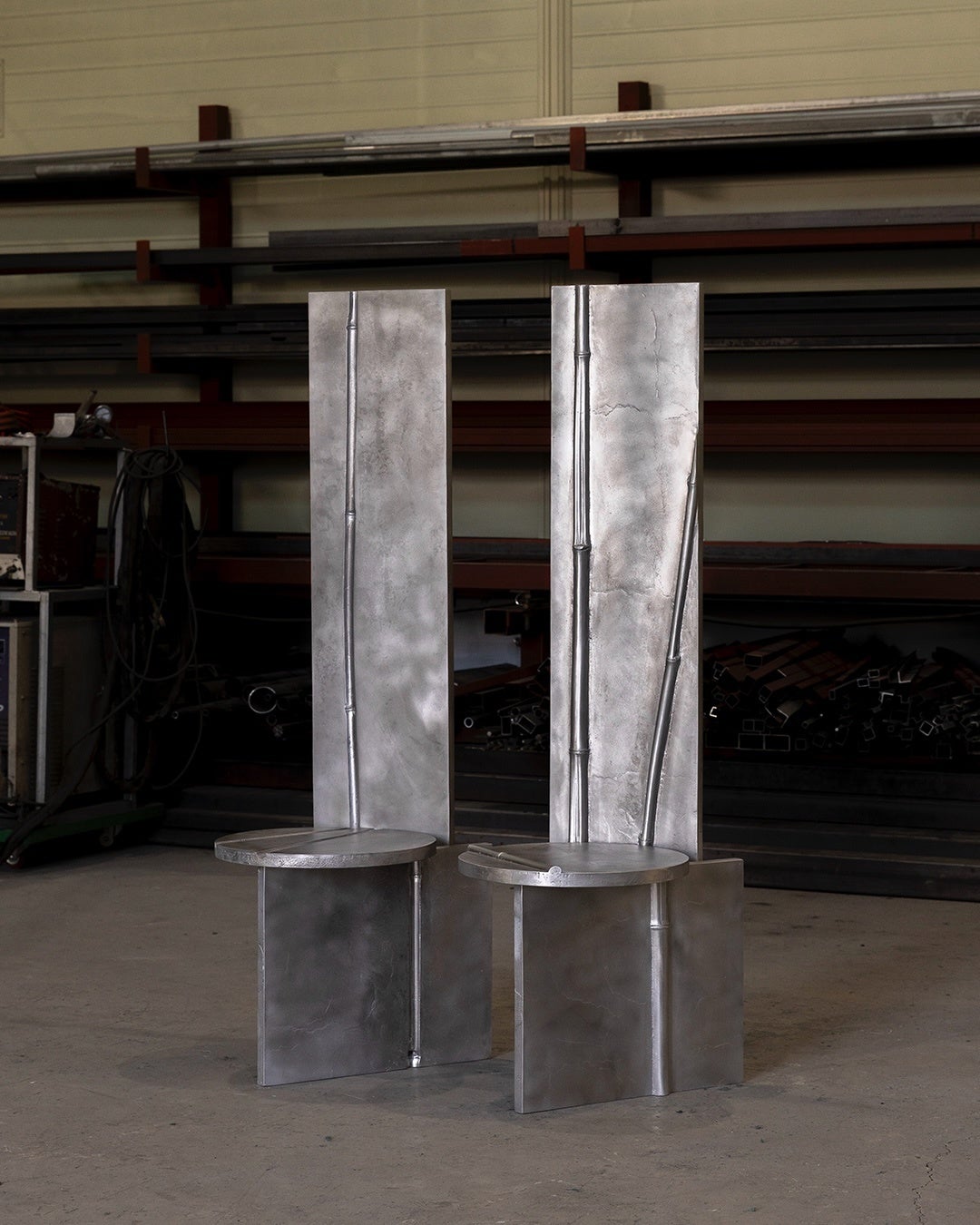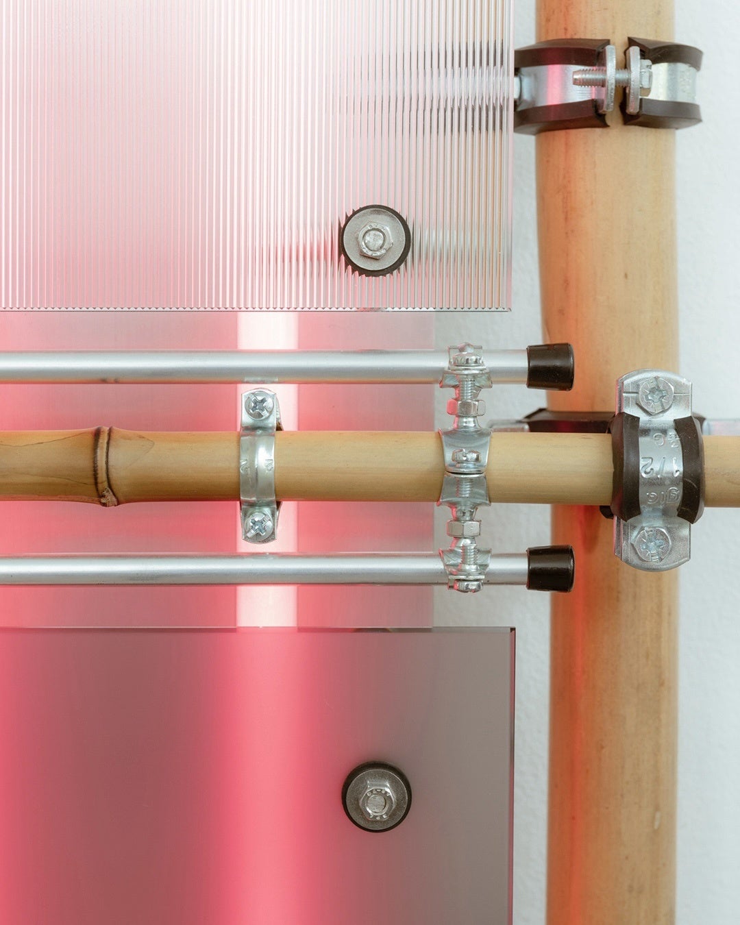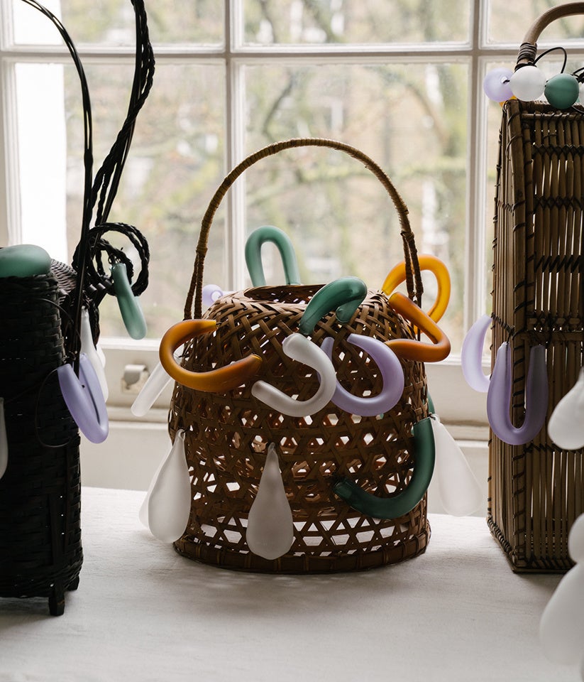 スウェーデン系チリ人アーティストのアントン・アルバレス(Anton Alvarez)は、バンブーのありのままのフォルムに着目した彫刻《1802251226》を制作しました。パレスチナ出身の建築家兼アーティストであり研究者でもあるディマ・スロウジ(Dima Srouji)は、竹で編んだカゴと手吹きガラスを組み合わせた作品《Hybrid Exhalations》を発表。プロダクト&テキスタイルデザイナーのバートヤン・ポット(Bertjan Pot)と、静物写真で知られるモーリス・シェルテンス(Maurice Scheltens)とリースベス・アベネス(Liesbeth Abbenes)によるユニット、シェルテンス&アベネスが所属するオランダのデザイン集団Kite Clubは、バンブーと現代的な素材を用いた凧のシリーズ作品を《Thank you, Bamboo》と名付けました。オーストリア人デザイナーのラウリズ・ガレ(Laurids Gallée)は《Scaffolding》という作品で樹脂を用いてバンブーという素材を再解釈しています。フランス人アーティストのナタリー・デュ・パスキエ(Nathalie Du Pasquier)は、バンブーパネルとシルク素材を用いた作品《PASSAVENTO》を制作。ソウルを拠点とするデザイナー兼アーティストのリー・シサン(Sisan Lee)は、バンブーとアルミニウムを用いた作品《Engraved》で韓国の伝統的な美学と現代的な技法を融合させています。そして、トリノとムンバイを拠点に活動するエウジェニオ・ロッシ(Eugenio Rossi)とヤーズド・コントラクター(Yaazd Contractor)のデュオによるthe back studioは、光のインスタレーション作品《bamboo assemblage n.1》を通して、バンブーという素材に新たな光を当て、伝統と現代性の融合を表現しています。