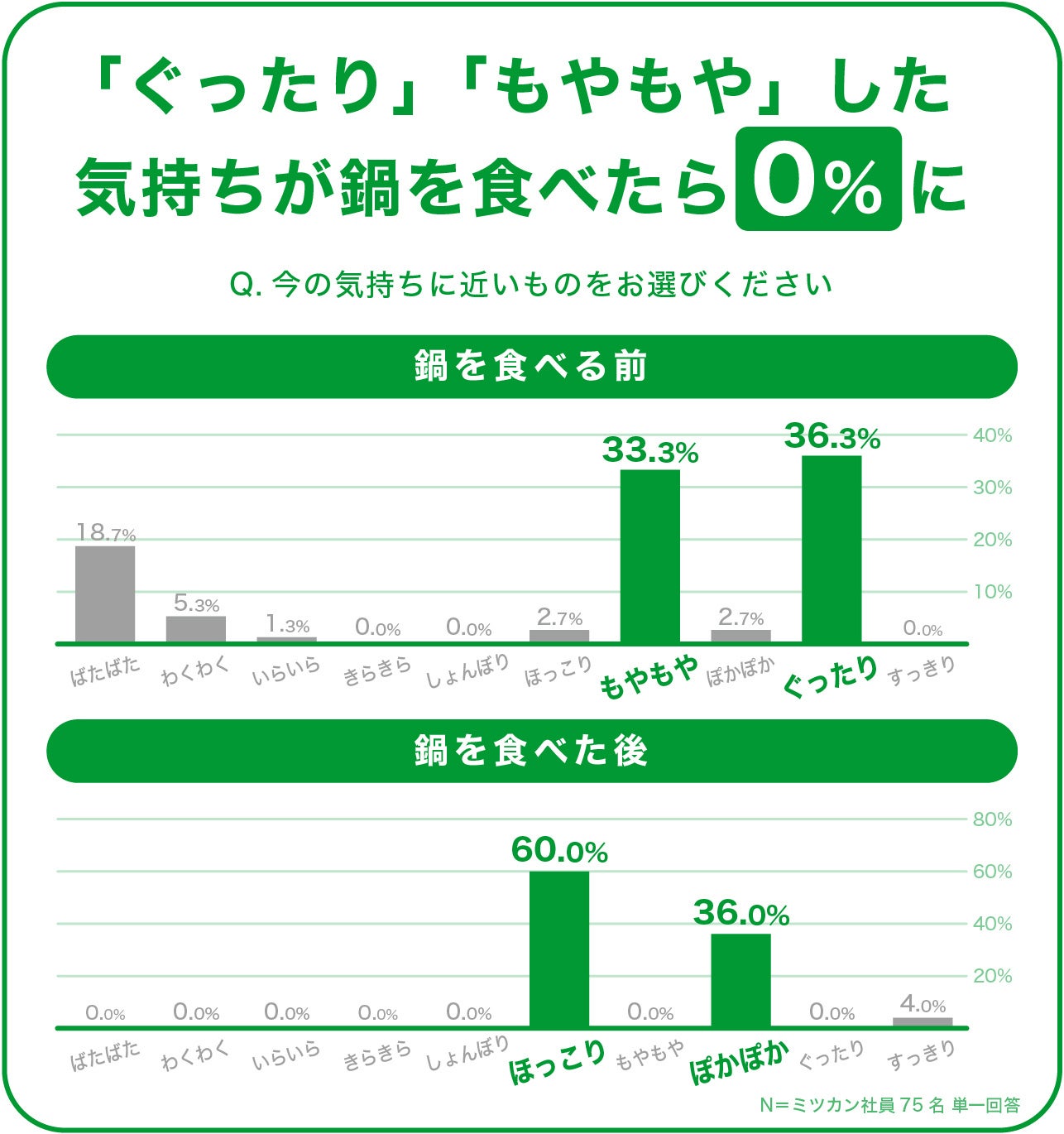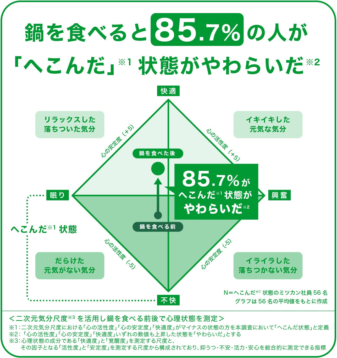 その結果、「へこんだ」※1状態の社員56名のうち85.7%がへこんだ状態がやわらぐ※2という試験結果となりました。また「ぐったり」「もやもや」した気持ちが鍋を食べたら「ほっこり」「ぽかぽか」に変化し、気持ちが落ち着いたという声も見られました。