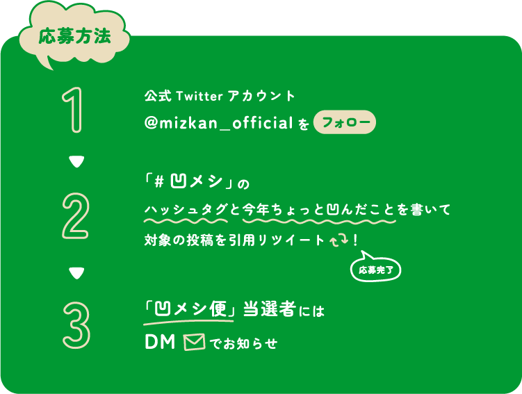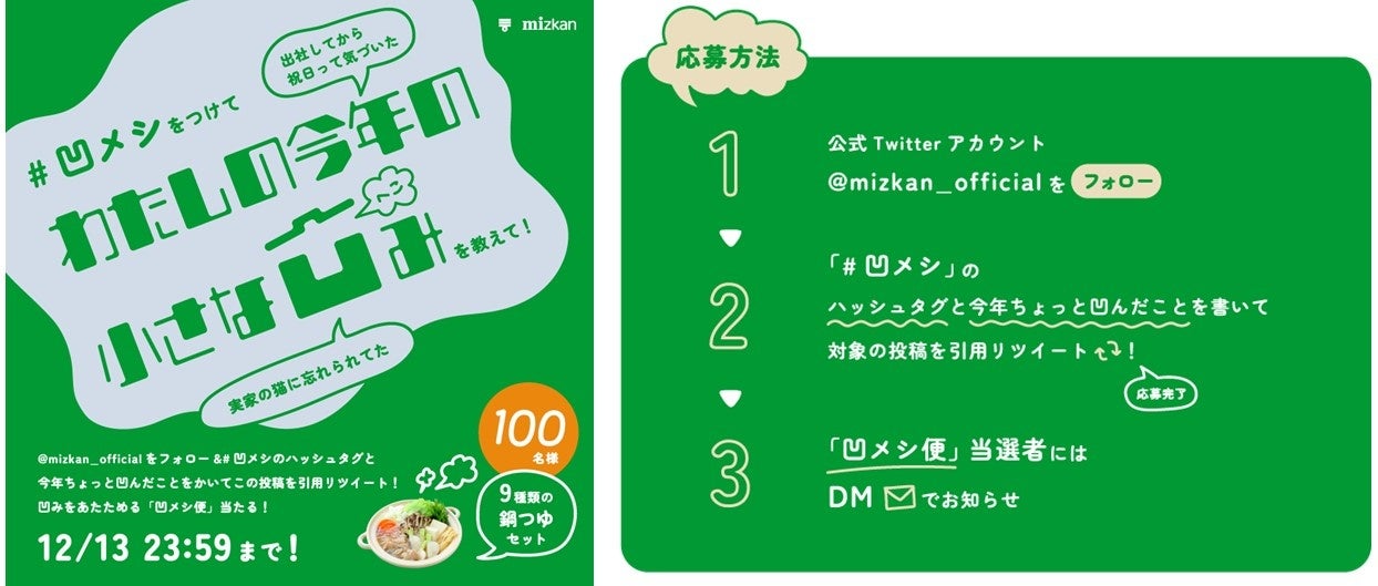 みなさんの“へこんじゃったな〜今年”というエピソードを、ミツカン公式アカウント(@mizkan_official)をフォローの上、指定のハッシュタグ「#凹メシ」をつけて対象の投稿を引用リツイートいただくと、抽選で100名様に「凹メシ便(鍋つゆ9種セット)」をプレゼントいたします。