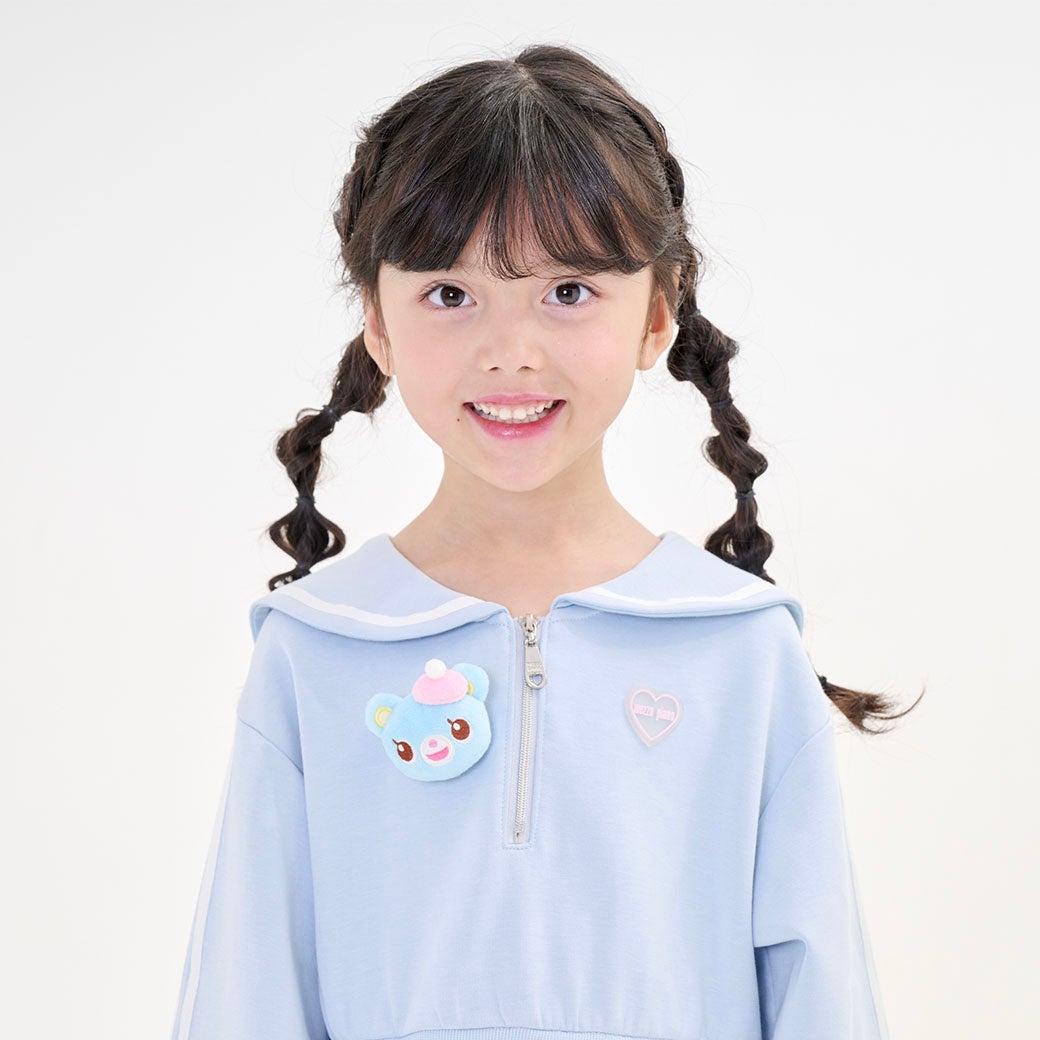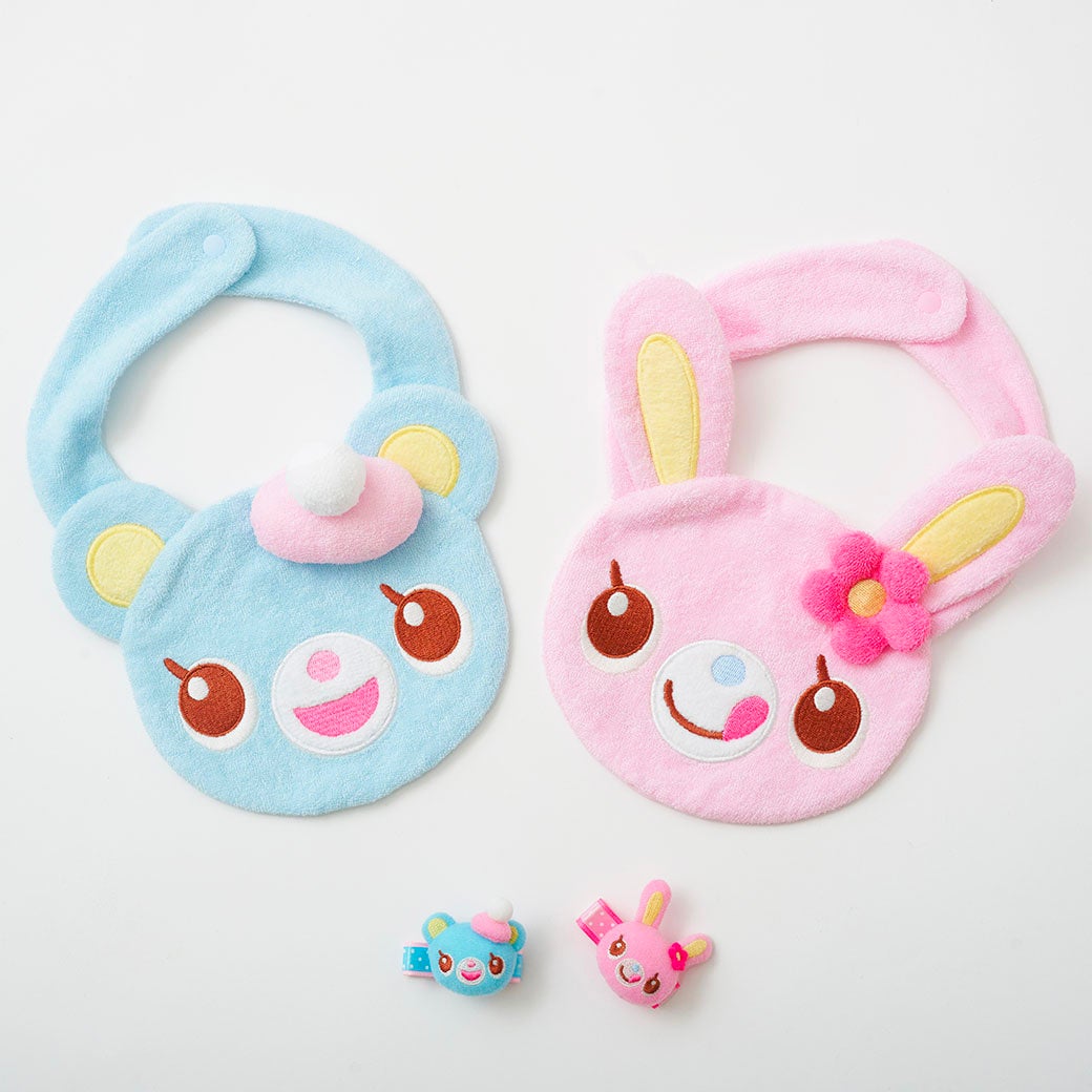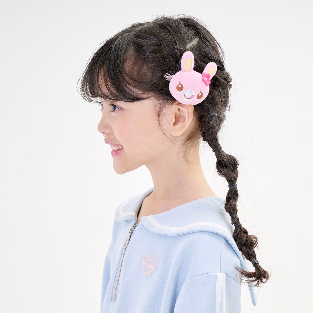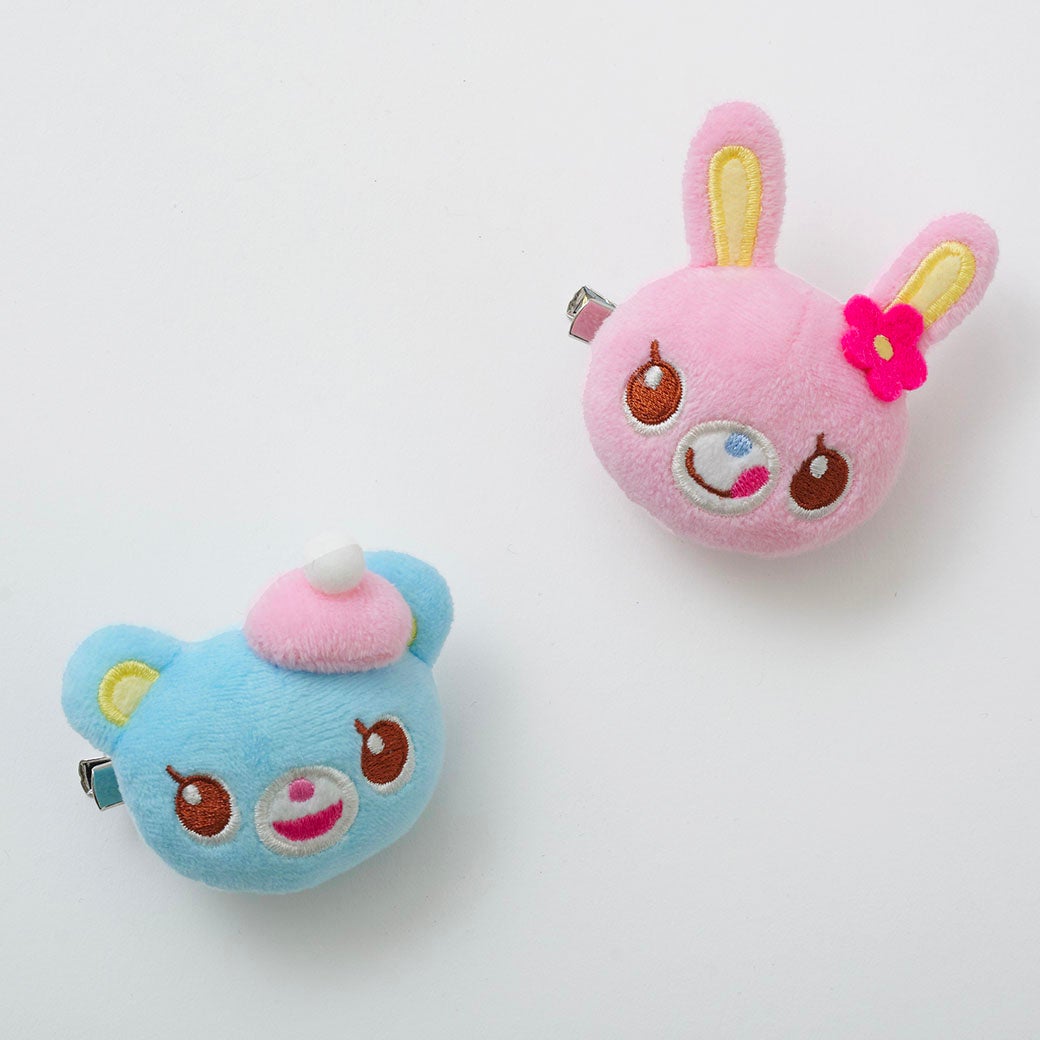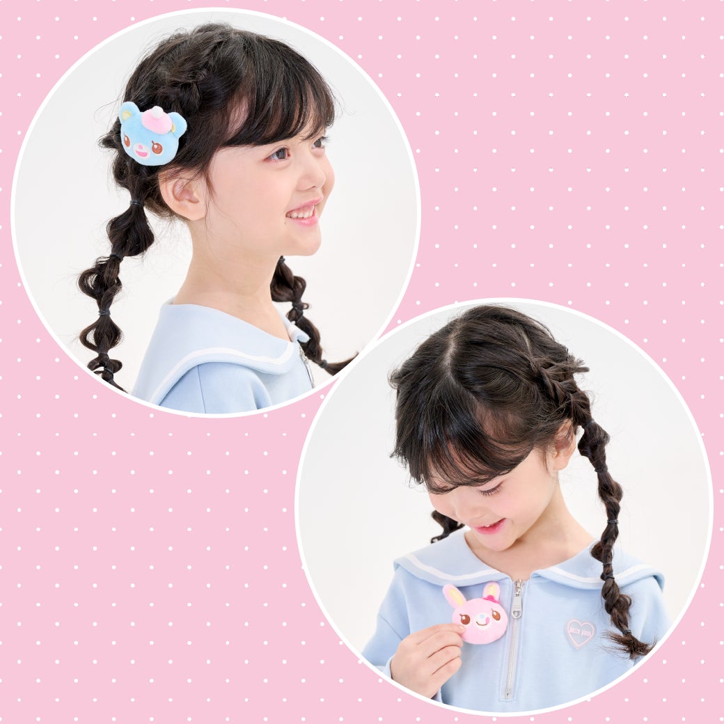 ミミちゃん、ポポちゃんのお顔型のぬいぐるみバッジ&ヘアクリップは、裏面にヘアクリップと、安心安全な回転ピンをつけたので2WAYで楽しめる仕様♪ヘアアレンジではもちろん、Tシャツやバッグにつけてミミちゃんポポちゃんと一緒に