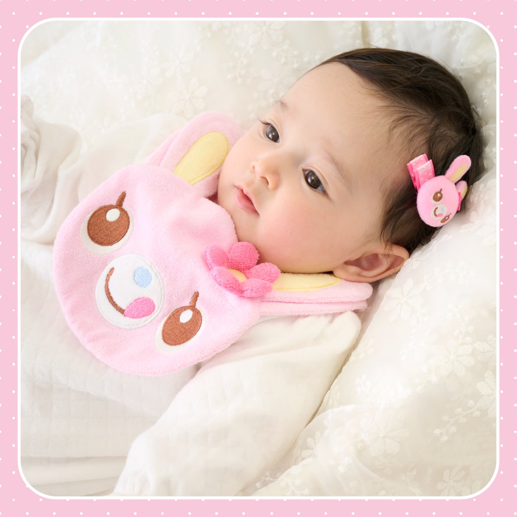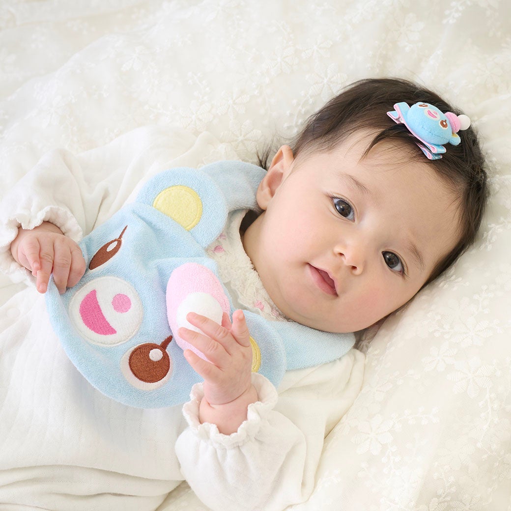 成長に合わせて調節も可能!モチーフ付きヘアクリップは、金具部分はグログランテープでカバーし、内側にはすべり止めをつけて赤ちゃんにぴったりの仕様♪スタイとヘアクリップを組み合わせたギフトもおすすめです