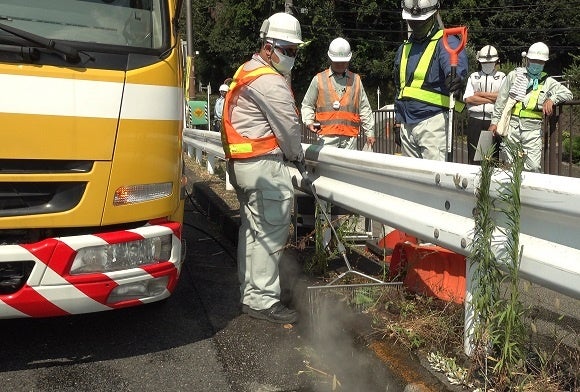 100℃近い高温水を散布し、植物の根のたんぱく質を変性させることで、成長や繁殖を抑制します。高速道路の中央分離帯、ガードレール下、路肩、サービスエリアのインターロッキングなど中央分離帯やサービスエリアなど人目に付く場所の除草に効果的です。除草剤を使用しないため環境に優しく、さらに次世代バイオディーゼル燃料(HVO100)に対応し、CO₂削減にも貢献します。2024年12月には国土交通省NETIS(登録番号:QS-240026-A)に登録され、直轄工事での採用も進んでいます。