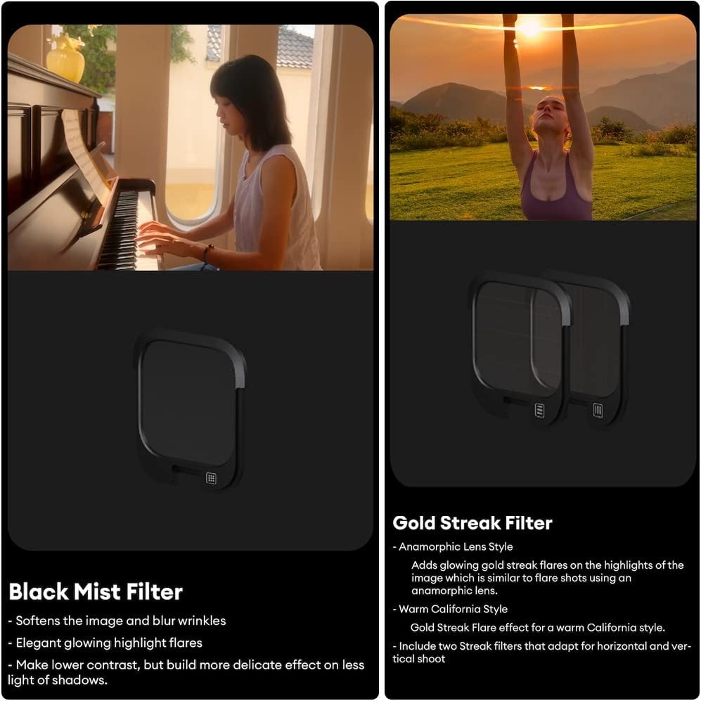 【ゴールド ストリークフィルター】: このフィルターはアナモルフィックレンズスタイル画面にします。ハイライトにゴールドストリークフレアを生成します。アナモフィックレンズスタイルのゴールドストリーク効果に似ています。 暖かいスタイルのカリフォルニアスタイルグレアを生成し、暖かいカリフォルニアスタイルの画面を実現します。 セットには水平撮影と垂直撮影に適応する2つのストリークフィルターが含まれています。