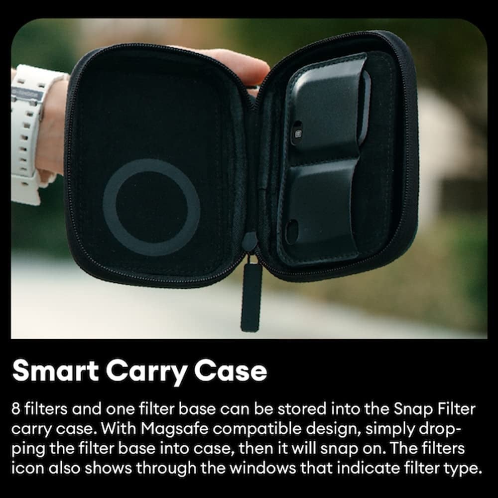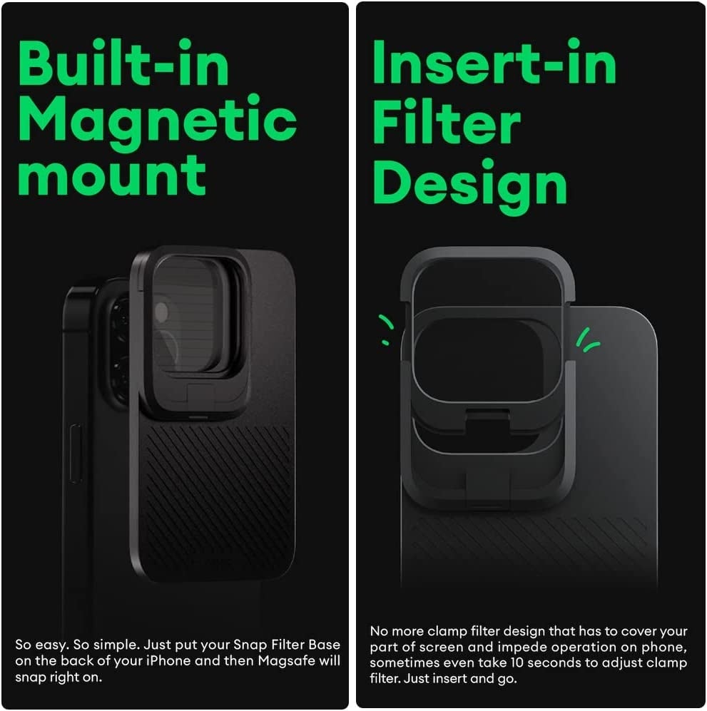 【内蔵磁気マウント】: 磁気設計で一秒で取付完了が可能です。Snap FilterベースをIphoneの背面に吸い込んで取付完了になります。【スロットインデザイン】: スマホの操作を邪魔するクランプ式フィルター設計とは異なり、スロットインデザインでフィルターの取付が簡単です。