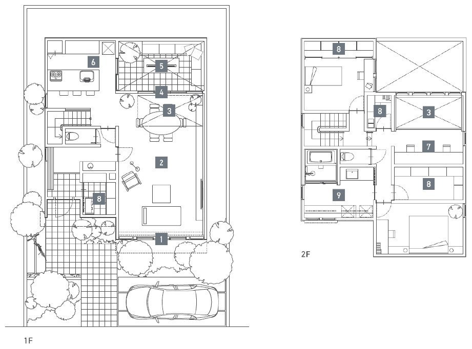 本プランの最大の特徴は、北側に大きく開いた窓と、外構パネルで囲まれた「ノースガーデン(北庭)」です。北向きの大開口は直射日光を避け、暑さ・眩しさを防ぐことができるため、カーテンを開けたまま一日を快適に過ごすことができます。南向きの開口でカーテンを併用する場合と同等の健康的な明るさ※1を、北向きの大開口でも十分に得られるというシミュレーション結果も出ています。※2また、外構パネルが周囲からの視線を遮るため、カーテンを閉めずに開放的に過ごせるプライベートな外部空間を実現。夏でも日陰で涼しく、子どもの遊び場としても最適です。相対する南側の窓はあえて低く抑え、2階のボリュームを張り出して強い日射を遮ります。さらに、南の下方から風を取り込んで北の高い窓へと風を抜く、微気候設計を採用しました。また、室内から室外への視線をコントロールして電線や街灯などのノイズをカットすることで、住まいに視覚的な静寂をもたらします。