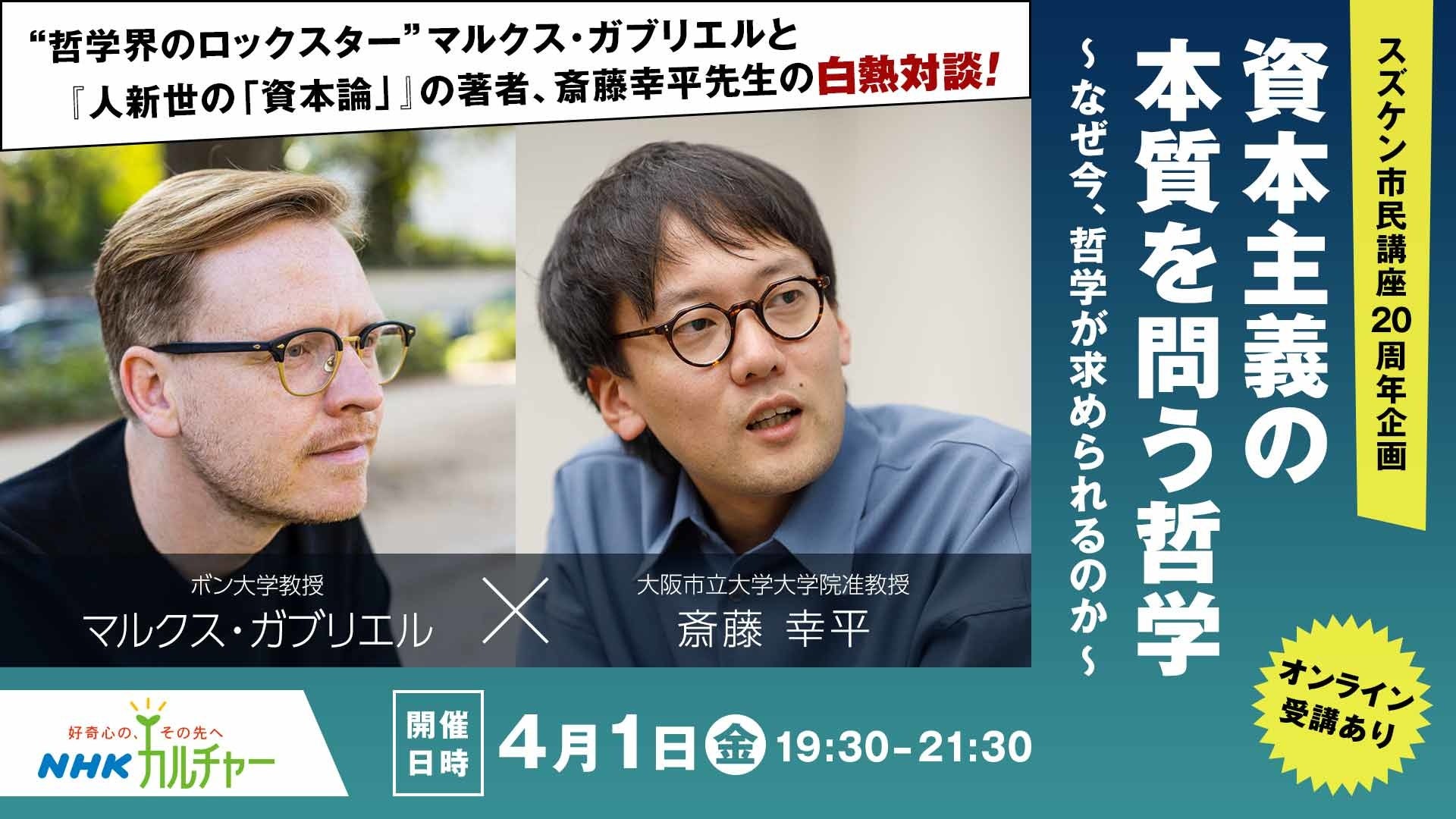 4月1日(金)19時30分より、マルクス・ガブリエル教授と斎藤幸平先生のオンライン対談講座を開催します。NHK番組『欲望の時代の哲学2020 マルクス・ガブリエル NY思索ドキュメント』で注目を集めた“哲学界のロックスター”はNHKカルチャー初登壇。「新型コロナ」「戦争」「気候危機」をキーワードに、資本主義とはなにかといった根源的な問題に迫りつつ、持続可能な社会の在り方を展望します。青山会場(東京都港区)にお越しいただいてのご受講は残席わずか、全国どこからでも参加できるオンライン受講も引き続き募集中です。オンライン受講のお申込者には、見逃し(アーカイブ)配信もついています。ドイツと東京を繋いだ白熱対談、お申込みはこちらから