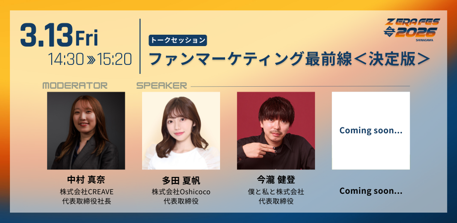 そんな「Z ERA FES 2026」に、昨年に続き僕と私と株式会社代表の今瀧健登が登壇!3月13日(金)に実施されるセッション「ファンマーケティング最前線」にて、ファシリテーターを務める株式会社CREAVE 代表取締役社長の中村 真奈氏、株式会社Oshicoco代表取締役の多田 夏帆氏とともに、“推し活”をはじめとする、ファンマーケティングの最前線についてディスカッションします。