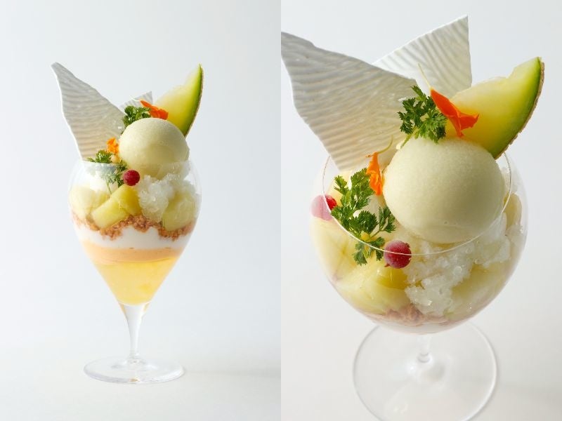 トップ部分をお楽しみいただいた後に現れるのは、口溶けのよいアーモンドミルクのジェラートやスパイシーさがクセになる生姜のグラニテ、やさしい甘さのバニラクリームなど、食感や、温度が異なる魅力的なコンテンツの数々。もちろん、旬のおいしさをそのままご堪能いただくためにフレッシュなメロン果実もパフェグラスの中にたっぷりと盛り付けられています。