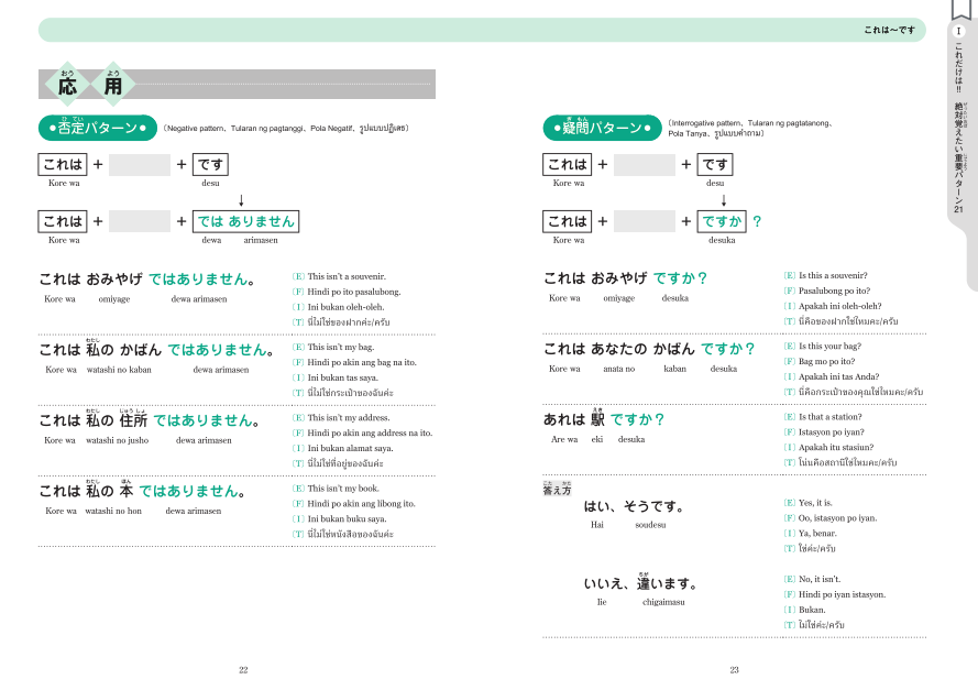 ・4言語の訳つき。パターン1~72の説明文、および会話フレーズに「英語、フィリピン語、インドネシア語、タイ語」の訳をつけています。