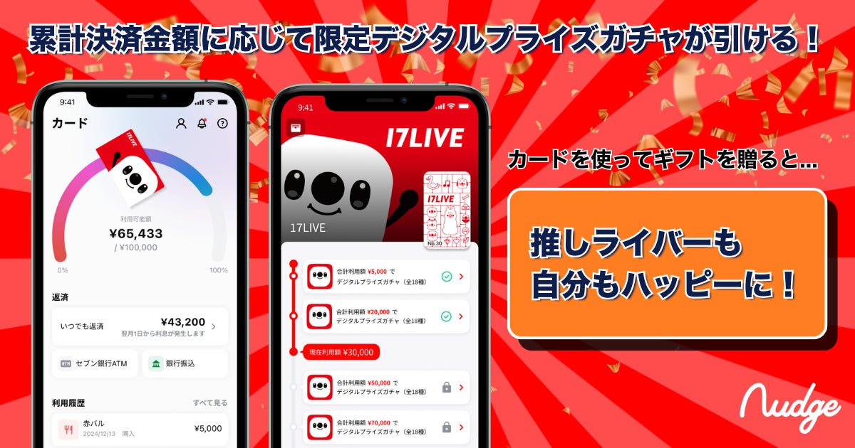 ナッジ株式会社(本社:東京都千代田区、代表取締役:沖田貴史)は、次世代クレジットカード「Nudge(以下「ナッジカード」)」の新ラインナップとして、日本最大級のライブ配信アプリ「17LIVE(イチナナ)」の公式クレジットカードを、2025年1月30日(木)より提供開始いたしました。