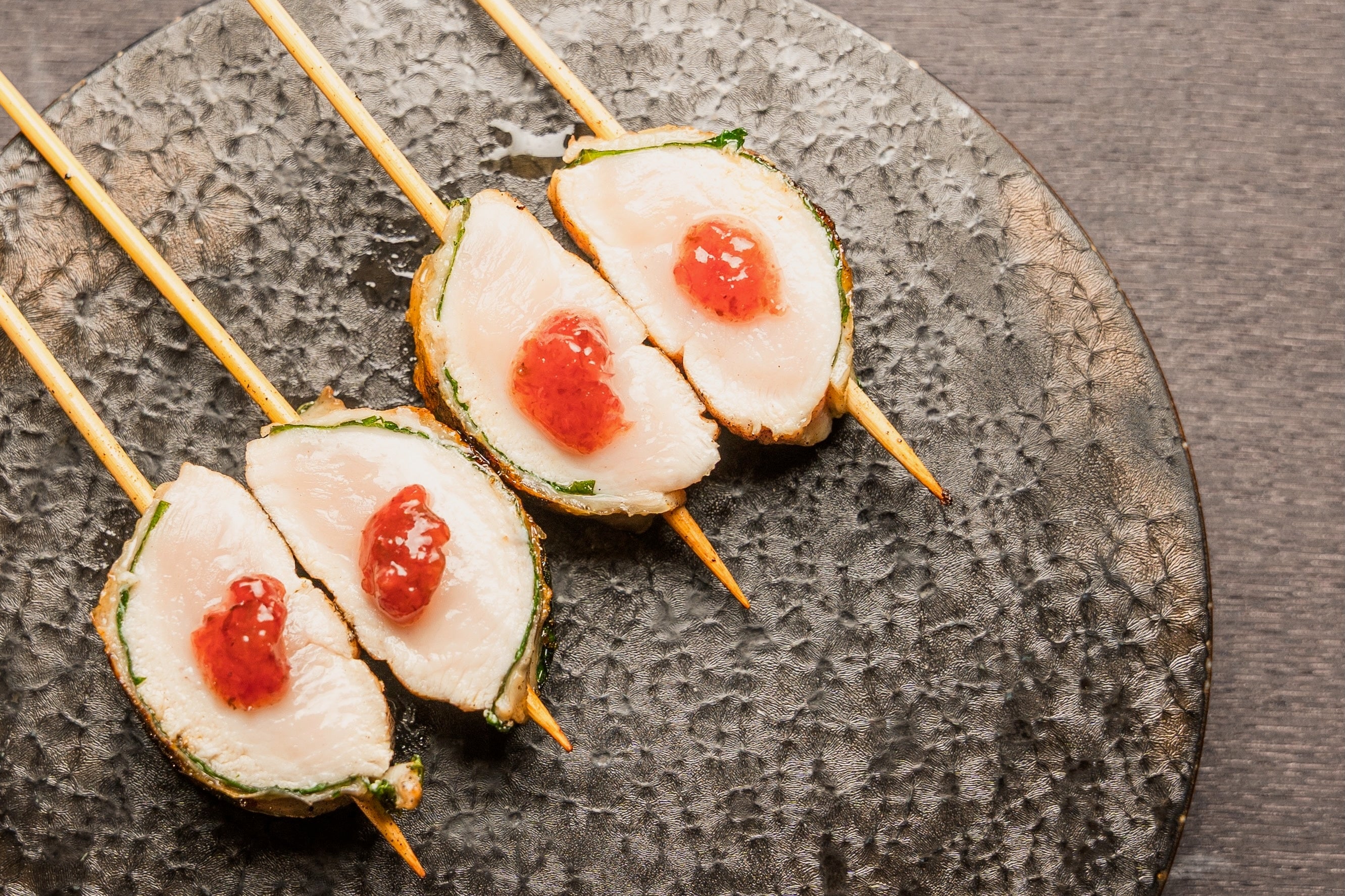 淡白でやわらかなむね肉を、大葉と鶏皮で丁寧に包み込み、梅の酸味でさっぱりと仕立てた一本。