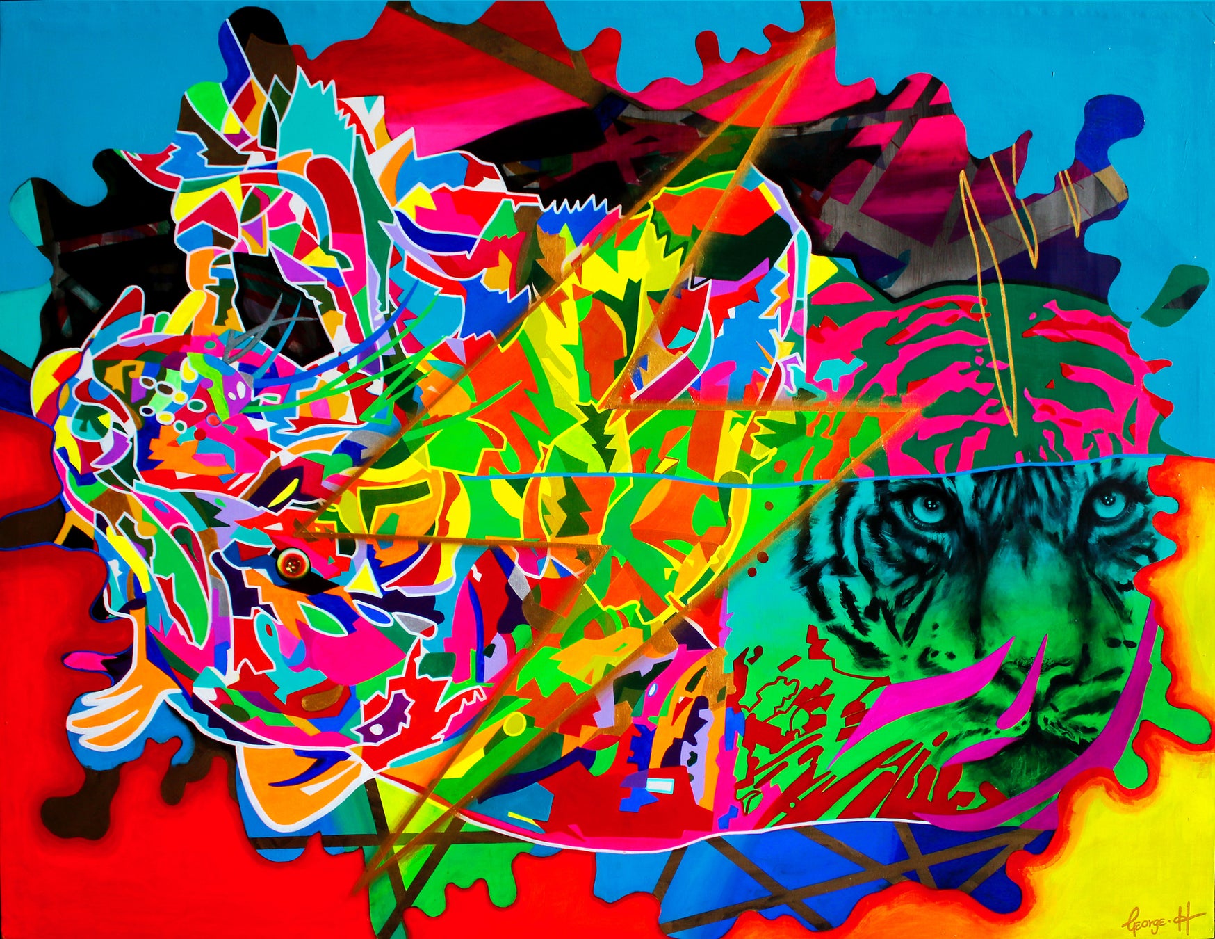 GEORGE HAYASHIは、祖母である日本画家の林素菊に習った水墨画の「余白と省略の美学」と思春期に最も影響を受けたストリートカルチャーを独自の解釈で融合した作風で知られ、ライオンやトラといった具象と赤色を印象的に用いる力強い色遣いの抽象を組み合わせた作品は、国内外で高く評価されています。