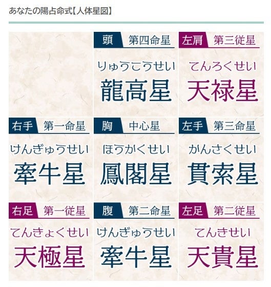「人体星図」は陽占とも呼ばれ、宿命と運命を表す8つの星を身体の各部分に当てはめたものです。8つの星は、どこにあるのかで意味や捉え方が大きく変わります。