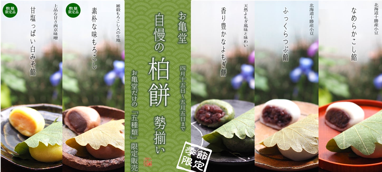 株式会社お亀堂(本社:愛知県豊橋市/代表取締役:森貴比古)は、4月15日~5月7日の期間限定で柏餅5種類を東三河の直営店舗にて販売いたします。