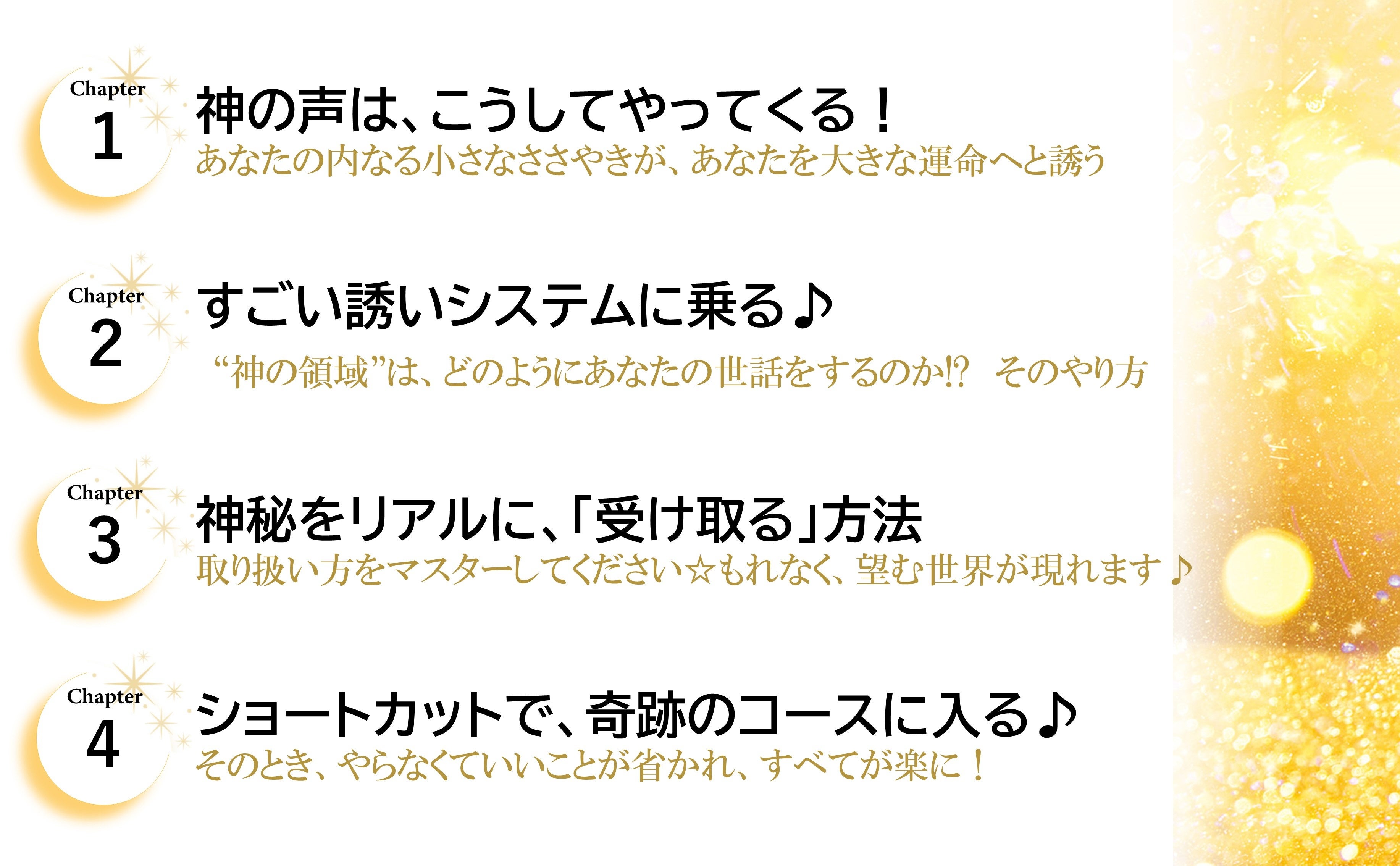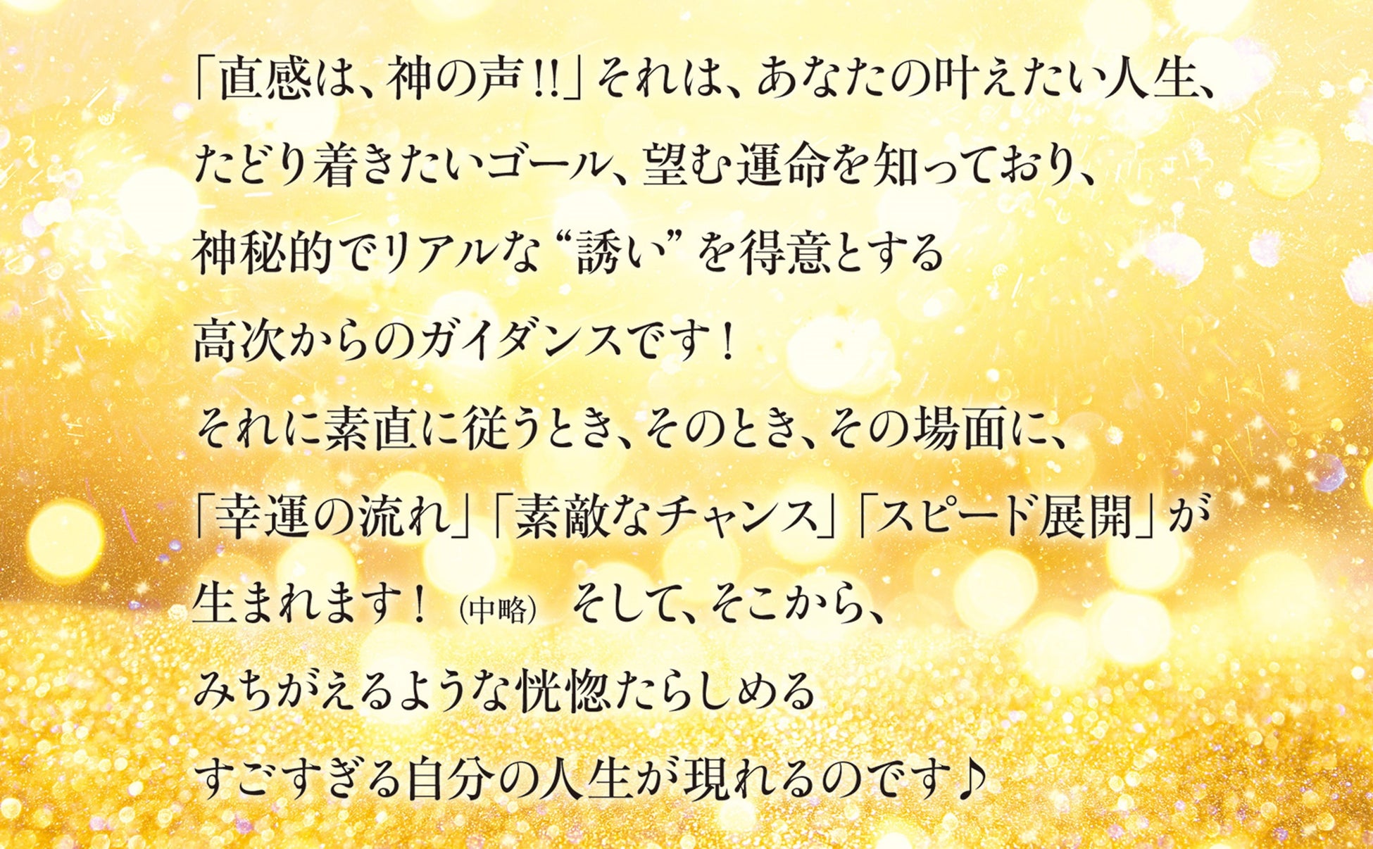 神は、あなたの願いや夢、叶えたいこと、たどり着きたいゴール、ハッピーエンドの運命を知っています。神秘的でリアルな天からの“誘い”を得意としており、ほとんど、「直感」という形をとってやってきます!