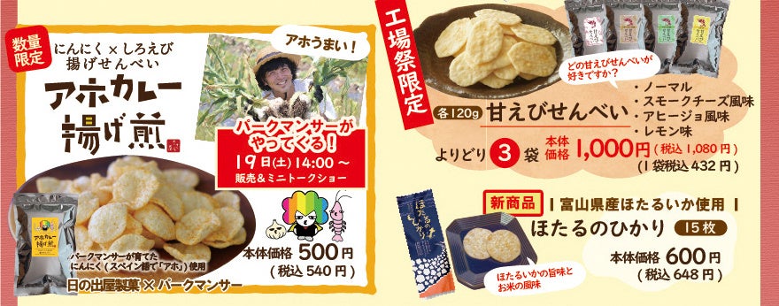 パークマンサーが富山の畑で育てたニンニク(スペイン語で「アホ」)と富山米と富山湾の宝石しろえびを使った大人気商品「アホカレー揚げ煎」を今年も工場祭で販売します。今年は「うま辛味」も新登場!
