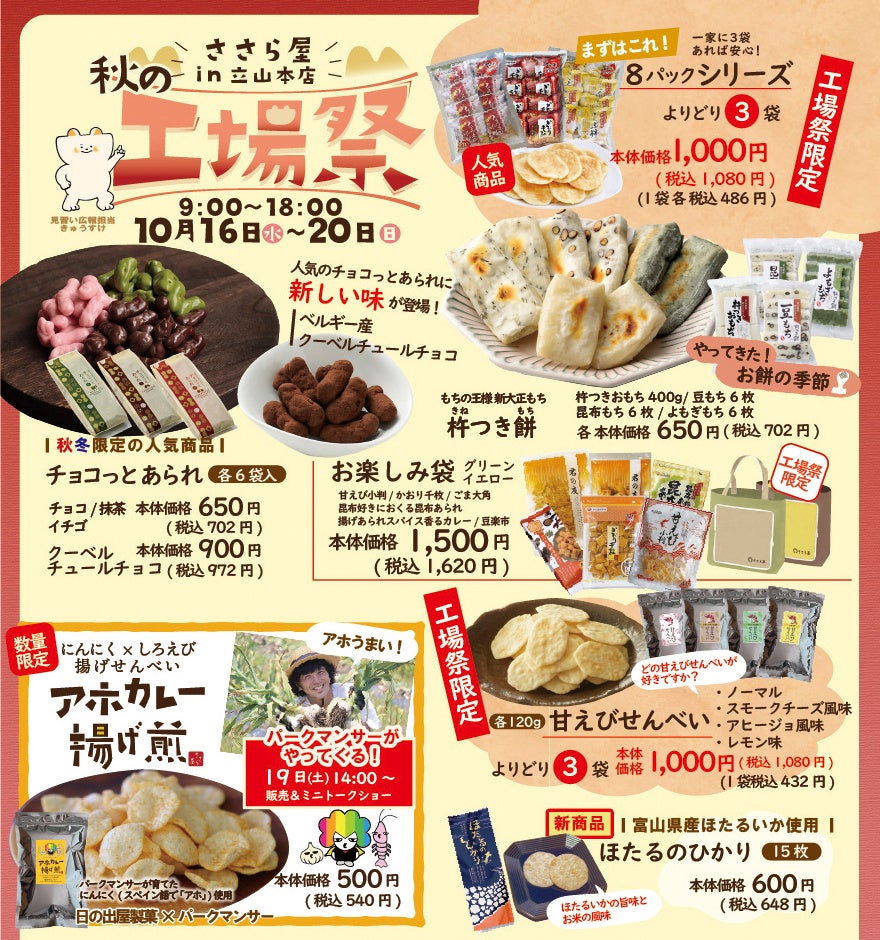 日の出屋製菓産業 秋の大型イベント【ささら屋立山本店 秋の工場祭】パークマンサーコラボ商品販売・ミニトークショー&工場長「工場見学ツアー」や限定商品も充実 2025年10月15日(水)~19日(日)