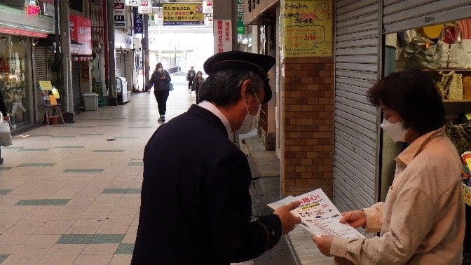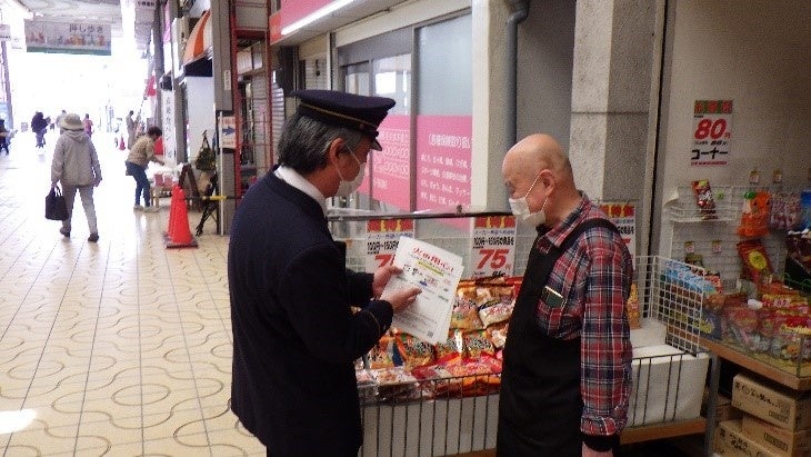 啓発内容:豊中市消防局予防課職員が、各商店街等管理者に火災予防に関するチラシを手渡すとともに、火気の取り扱いについて注意を促し、火災発生の防止について注意喚起を行いました。
