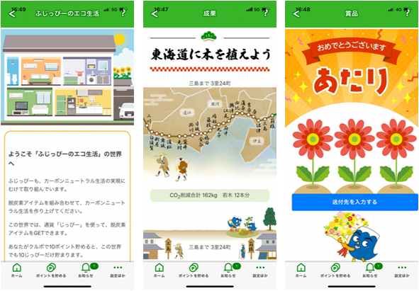 ・脱炭素ライフに必要なアイテムを集める「ふじっぴーのエコ生活」など、ゲーム感覚で楽しく続けられる仕組みを導入