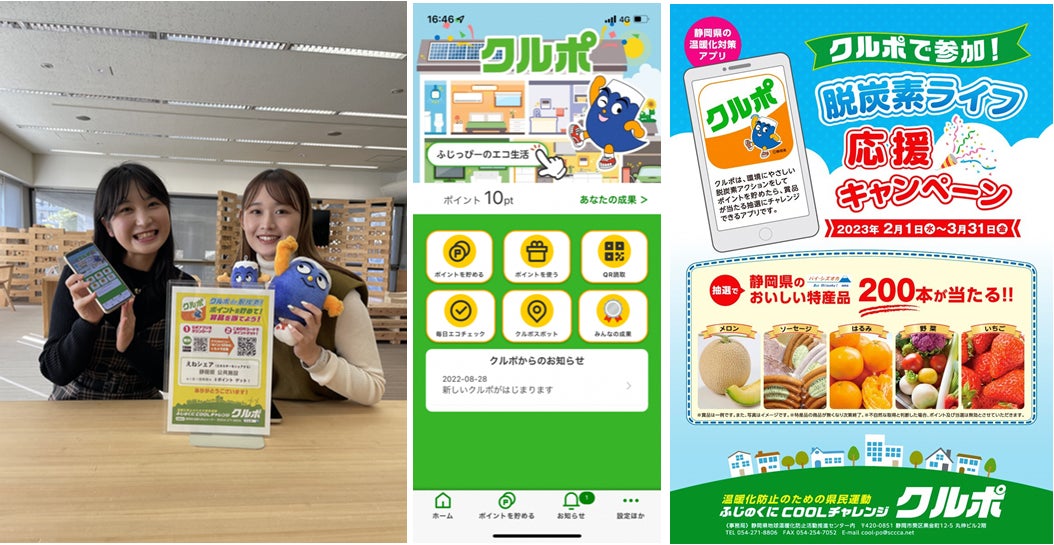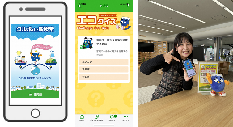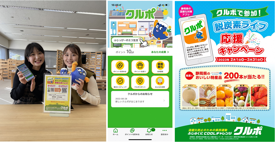 静岡県では、県内の温室効果ガス排出量を2030年度までに2013年度比で46.6%削減する目標を掲げており、目標達成のため、県民一人ひとりの行動変容を一層促し、脱炭素型ライフスタイルへ転換を図るため、アプリ「クルポ」をリニューアルしました。
