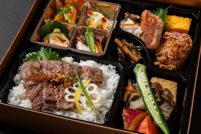 特選牛のステーキを贅沢に使用。真心込めてお作りする季節のお惣菜で彩りを添えて。