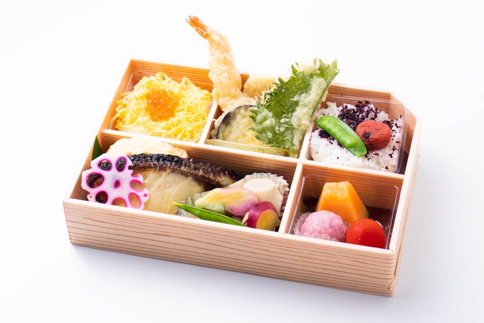 銀ひらす西京焼をメインに、副菜も充実。しっくりと染み入るような和風のお弁当。
