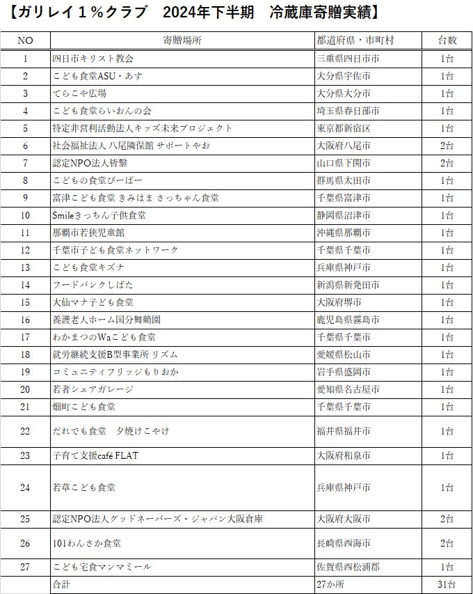 【ガリレイ1%クラブ】子ども食堂等に冷蔵庫31台寄贈2024年度下半期実績