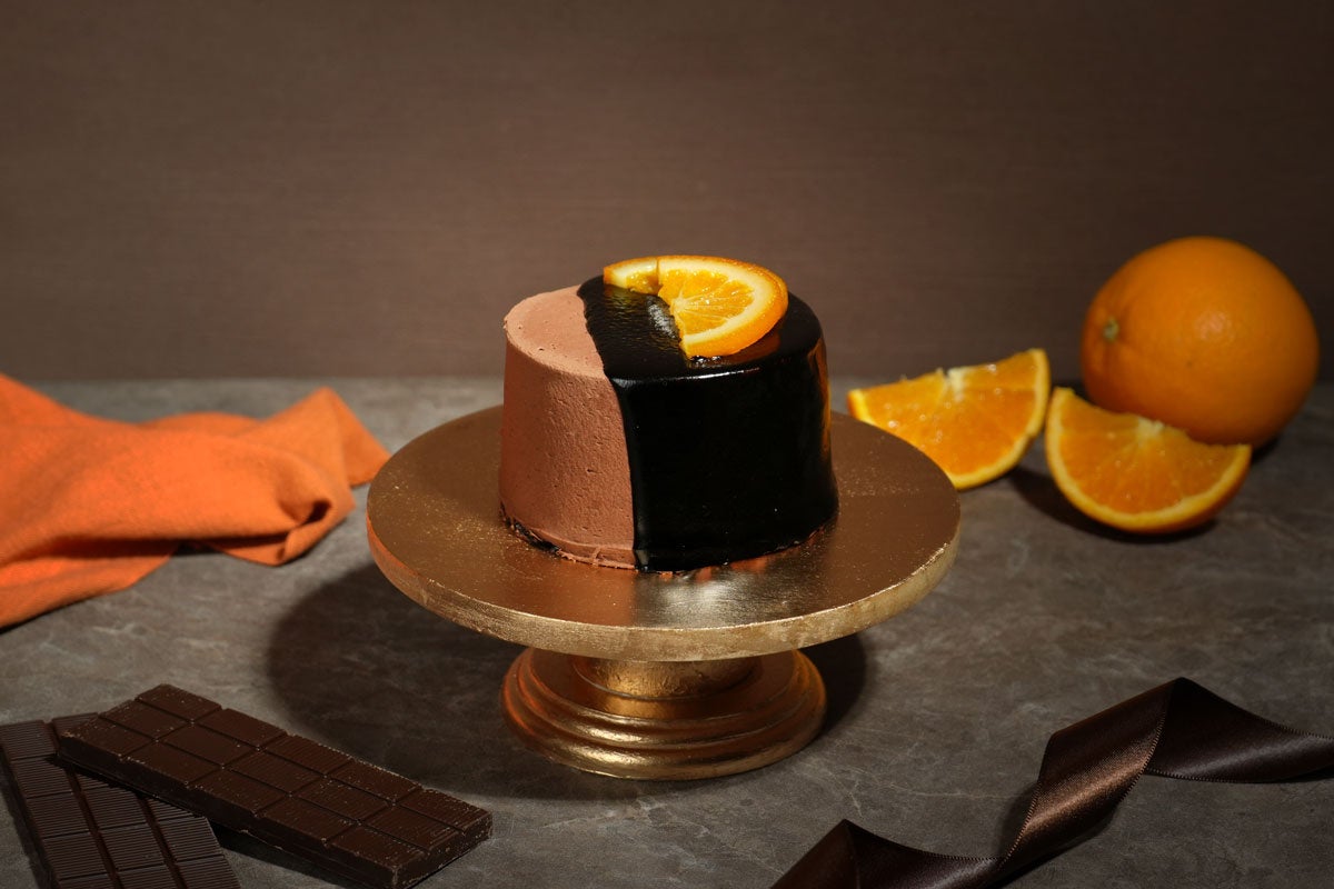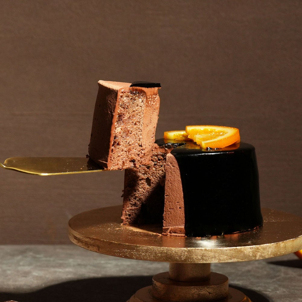 天面を覆う艶やかなグラサージュと、大胆に添えられた砂糖漬けオレンジが、バレンタインの夜に華やぎを添えます。シフォンケーキ特有の軽やかな食感により、濃厚なカカオの風味を最後まで存分に堪能できる、贅沢な一品です。
