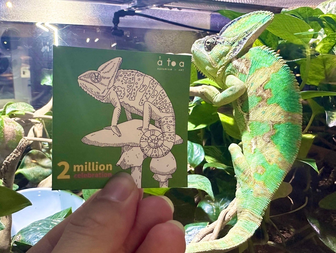 3色のカラーバリエーションで、アトアで飼育しているエボシカメレオンがモデルになったデザインです。何色がもらえるかは来てからのお楽しみ!