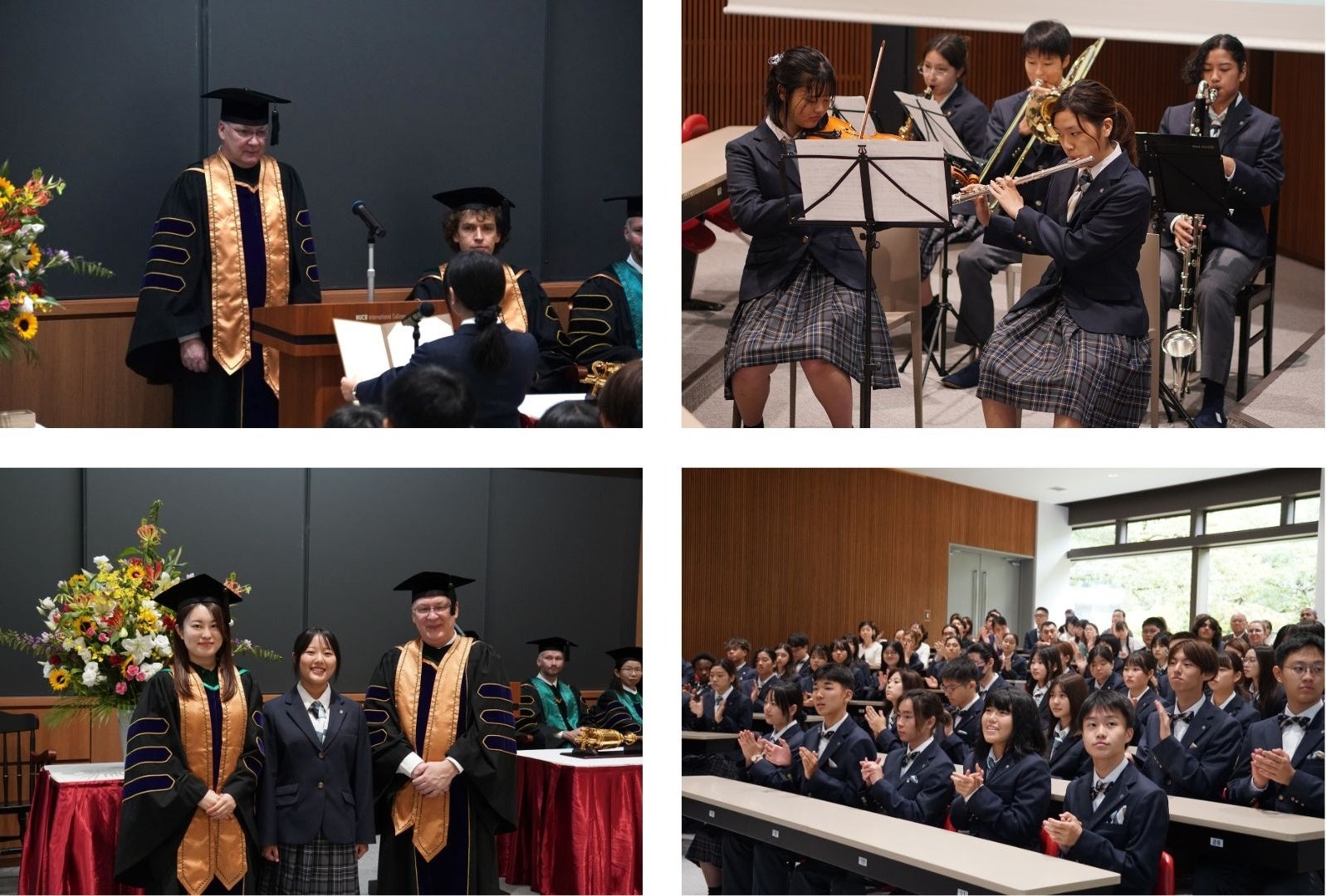 入学式では、新入生代表の庭田日菜子さん(愛知県出身)が、「学業面でも生活面でも仲間と協力しながら、勤勉に努力することと、常にベストを尽くすることを心掛け、グローバルな舞台で活用できるリーダーになることを目指します。」と、これから始まる学校生活への意欲を述べました。さらに、歓迎の意を表して、国際高等学校において生徒会長としての役割を担うヘッドボーイとヘッドガールがスピーチを行うとともに、新入生のために在校生が準備した音楽演奏が披露されました。