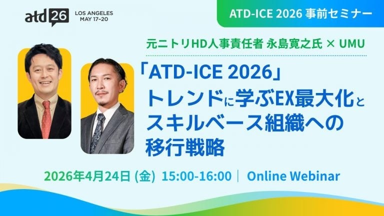 パフォーマンス向上を支援するAI学習プラットフォーム「UMU(ユーム)」を展開するユームテクノロジージャパン株式会社(本社:東京都新宿区、代表取締役:松田 しゅう平 、以下 ユームテクノロジージャパン)は、トイトイ合同会社(代表:永島 寛之)と共同で、「『ATD-ICE 2026』トレンドに学ぶ、EX最大化とスキルベース組織への移行戦略」と題するオンラインセミナーを、2026年4月24日(金)15:00より開催いたします。