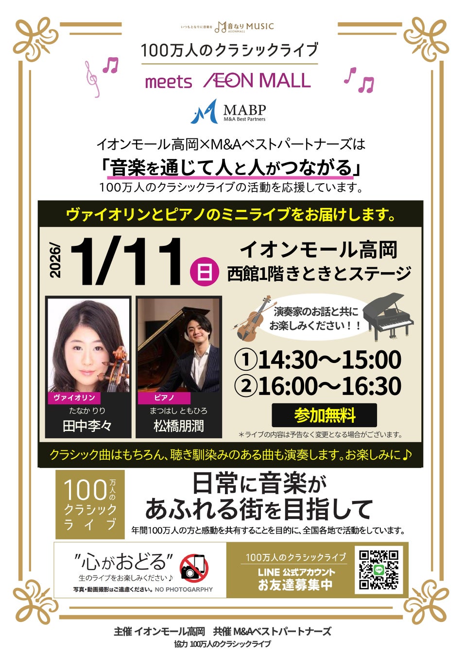 製造、建設、不動産、医療・ヘルスケア、物流、ITに特化したM&A仲介を⾏う株式会社M&Aベストパートナー(本社:東京都千代田区、代表取締役社長:齋藤 達雄 以下M&Aベストパートナーズ)と、一般財団法人100万人のクラシックライブ(東京都千代田区、代表理事:蓑田秀策 以下100万人のクラシックライブ)は、1月11日(日)14:30/16:00より、イオンモール高岡にて、クラシックライブを開催することをお知らせいたします。