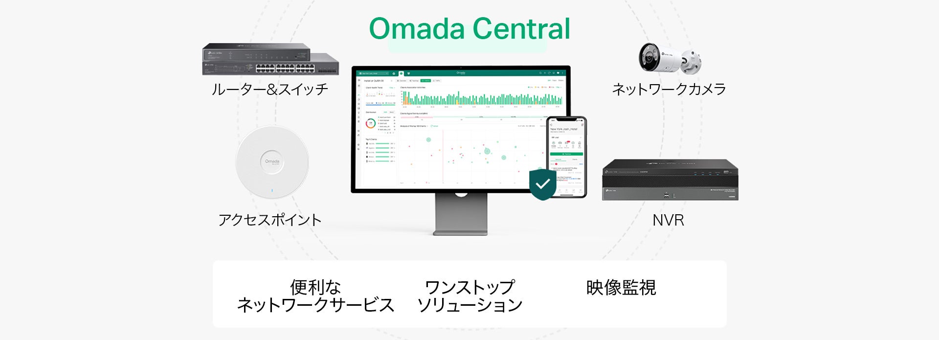 Omada Central Essentialsは、アクセスポイント・スイッチ・ルーター・カメラ・NVR・ソーラー給電システム等のOmadaネットワークおよびVIGIセキュリティシステムを統合し、より手軽な一元管理を実現した無償のクラウドベースプラットフォームです。既存のOmada Cloud Essentialsのアップグレード版としてVIGIシリーズもまとめて管理可能となり、シンプルな監視ネットワークや中小規模ビジネスでの利用に最適です。