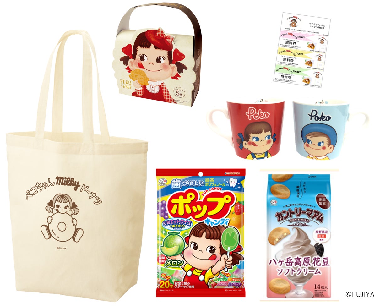 「ペコちゃんmilkyドーナツ」ロゴが入ったオリジナルのトートバッグに、「ペコサブレ」や不二家のお菓子、グッズを詰め合わせました。お得なドーナツクーポン付きです。