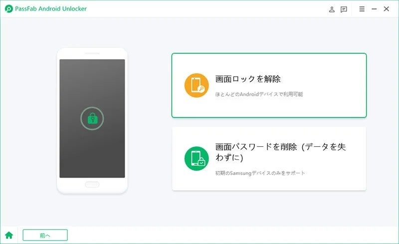 Step1:PassFab Android Unlockをパソコンにダウンロードしてインストールします。同ソフトを起動するとメニュー画面が表示されます。