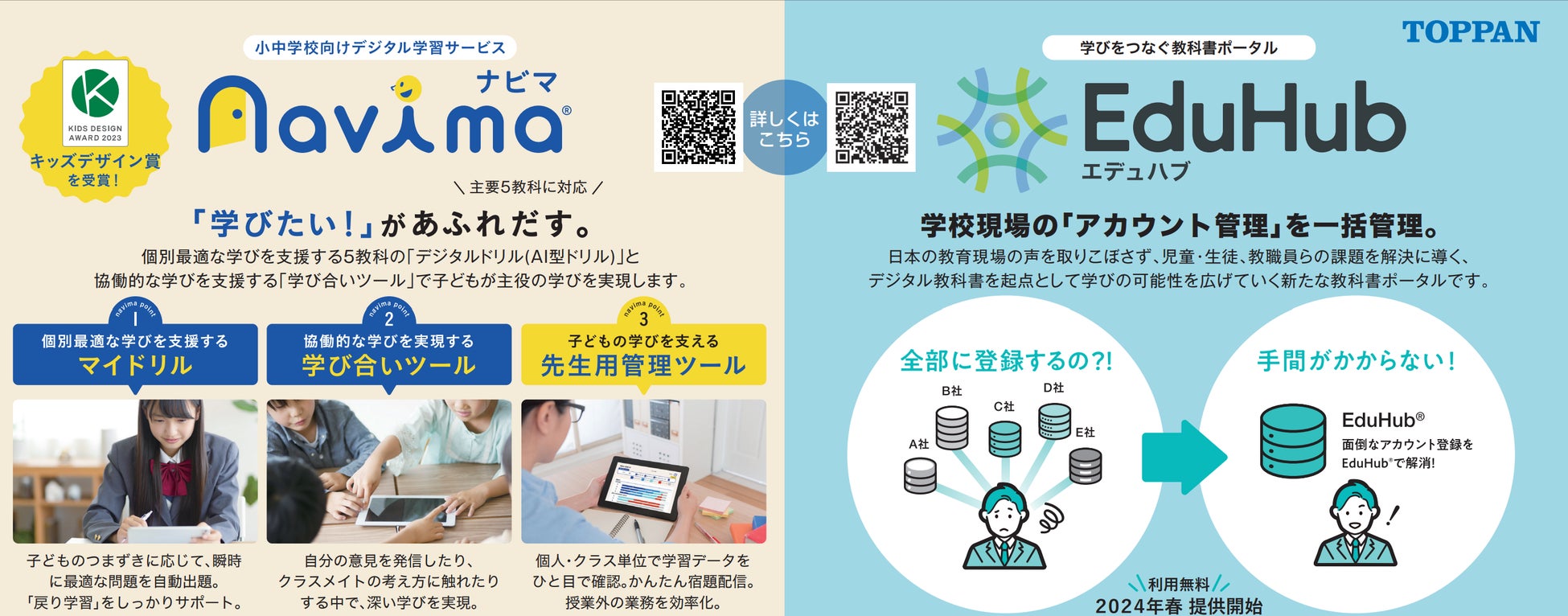 【EduHub】 2024年春にリリースしたデジタル教科書ポータル「EduHub」。複数社の教科書を一つの本棚から開くことができる機能でシームレスな学びを実現。【navima】 個別最適な学びを支援する5教科のデジタルドリル(AI型ドリル)+協働的な学びを支援する学び合いの機能により、子どもが「主役」のまなびを実現。