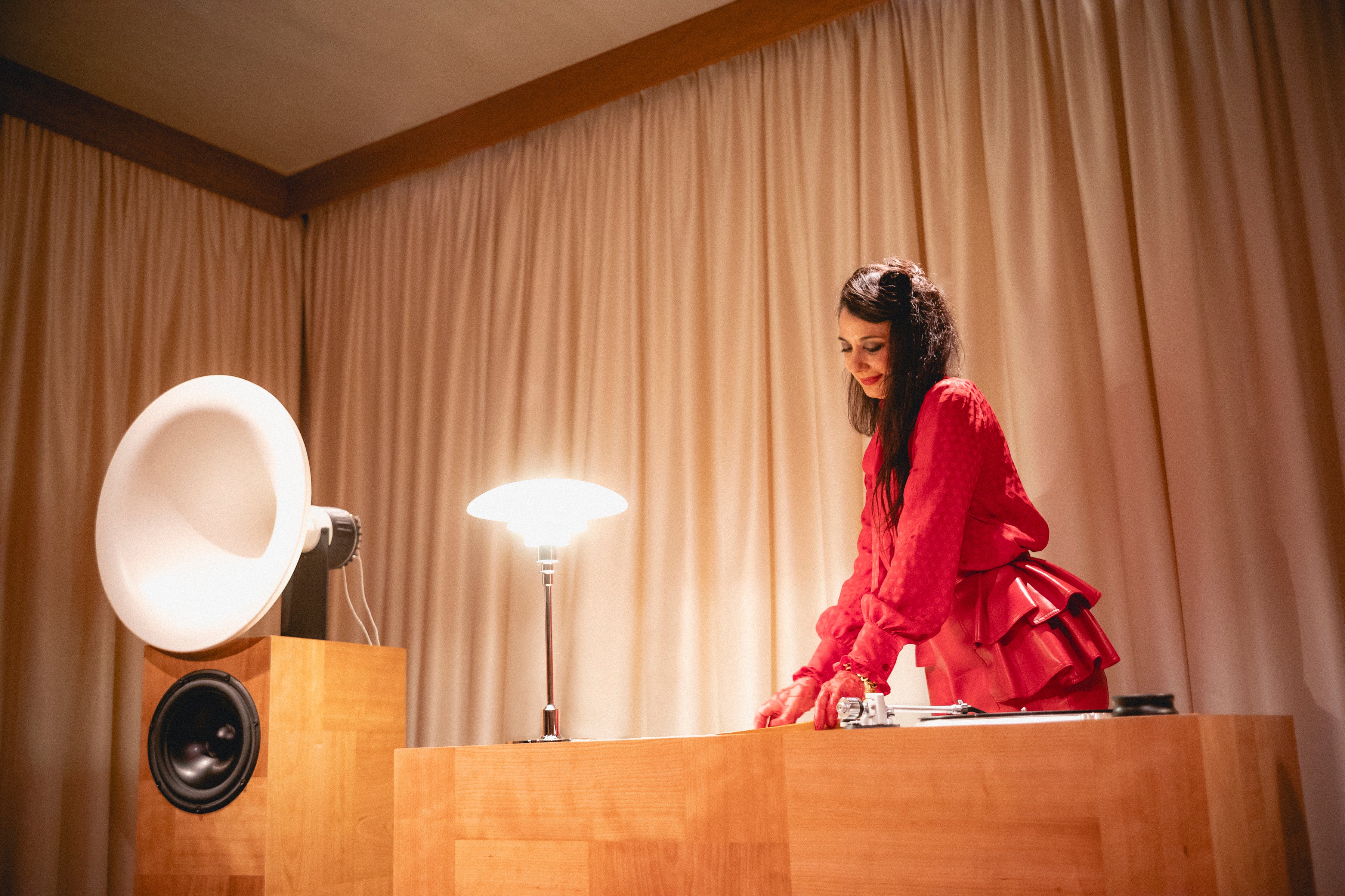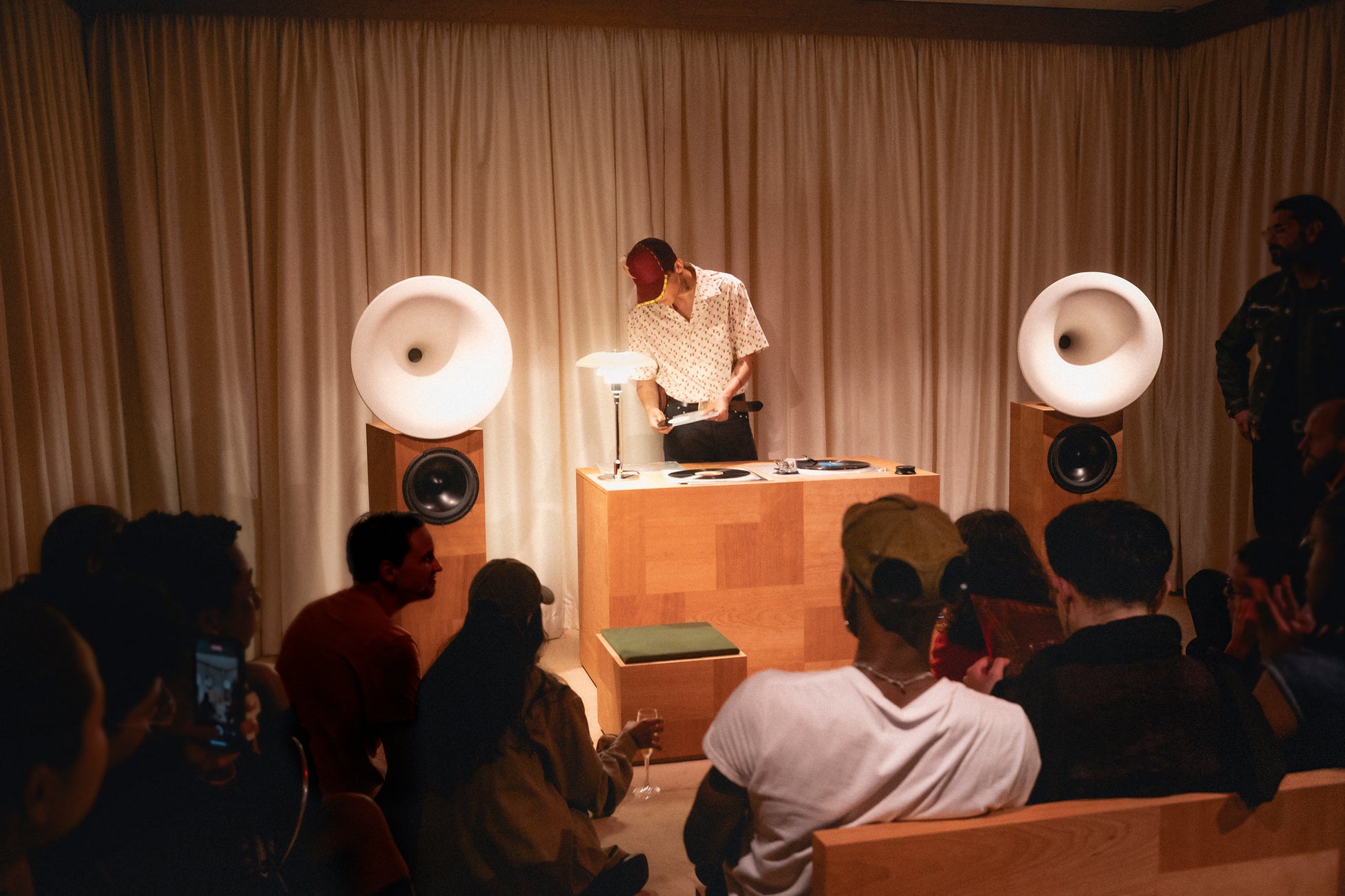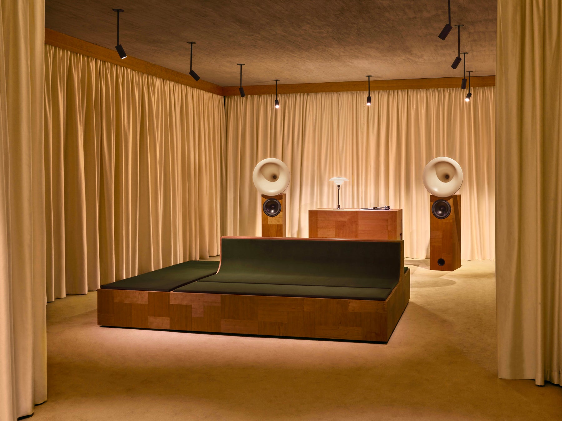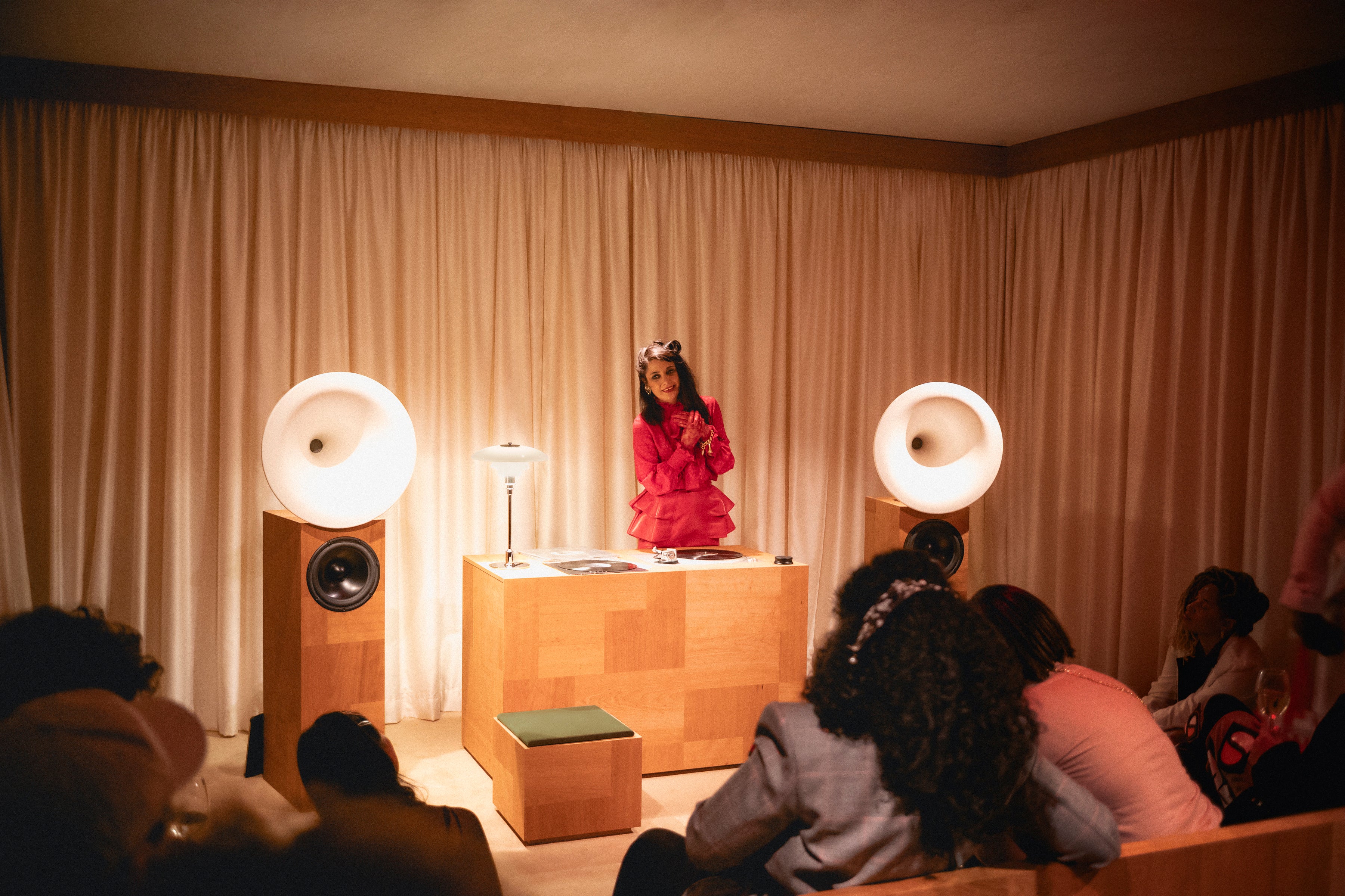 建築家フランチェスコ・ルピアとのコラボレーションによりデザインされたこの空間は、特注のサウンドシステム、伝統的な家具製作から着想を得て、ハンドクラフトされた多機能リスニングコンソール、ベルベットのクッションを備えたモジュール式シートという、建築的な対話するように調和を奏でる3つの要素を中核として構成されています。それぞれが木材を用いた精巧なパッチワークで覆われており、複雑なディテールが垣間見えるとともに、クラフツマンシップ、親密さ、時代を超越したものへのコミットメントが強調されています。前衛的なリスニングサロンのスピリットを呼び起こし、質感豊かな素材やドレープが施されたファブリックが、デザインと建築、サウンドをシームレスに融合し、訪れるひとびとを触覚と聴覚の両方から包み込む体験へと誘います。