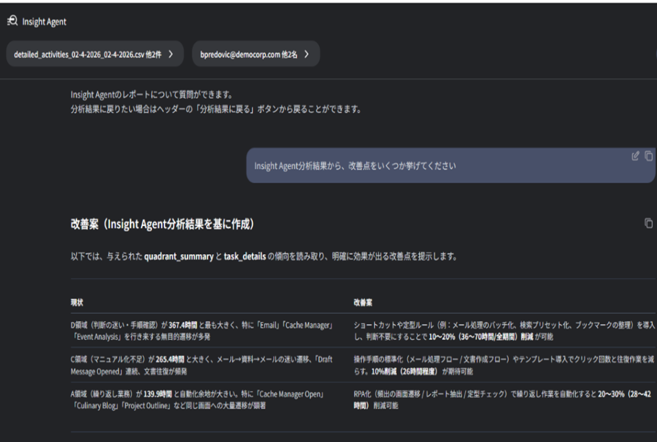 Insight Agentは、専門知識を要せずチャット形式で指示するだけで、生成AIを用いてログを解析し、数値根拠に基づく業務分析やレポート作成、課題の深掘りを行います。例えば、複数システムへの同一データの重複入力といった非効率な作業を検出した場合には、データを根拠に「業務プロセスの自動化」や「入力フォームの統合」といった具体的な改善策を提案します。PCの操作ログは、検索拡張生成(RAG※2)技術を通じて業務改善に関するナレッジを収集することで、提案の信頼性を保ちます。
