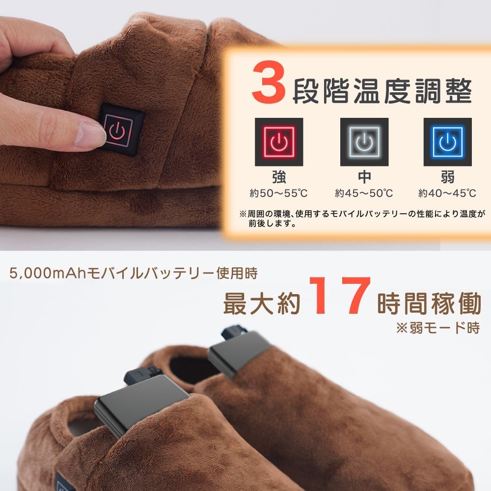 外側のスイッチ部分を押すことで3段階の温度切り替えが可能(高約55度/中約50度/低45度)。付属のケーブルでUSBACコンセントなどから直接電源を取って使うこともできます。5000mAhのモバイルバッテリーで最大約17時間稼働(低モード時)します。フリース素材を採用。足底は滑り止め加工。汚れたら洗濯機で洗濯可能。いつでも清潔お使いいただけます。