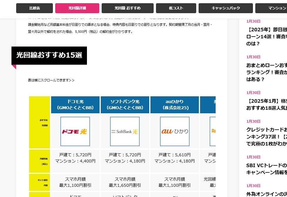 2025年1月31日(金)より、光回線カテゴリの記事内でスクロールの手間を軽減するために「ページ内リンク機能」を実装しました。ページ内上部に表示されている「比較表」や「低コスト」のボタンをタップすると、簡単に商品比較箇所に遷移することができます。