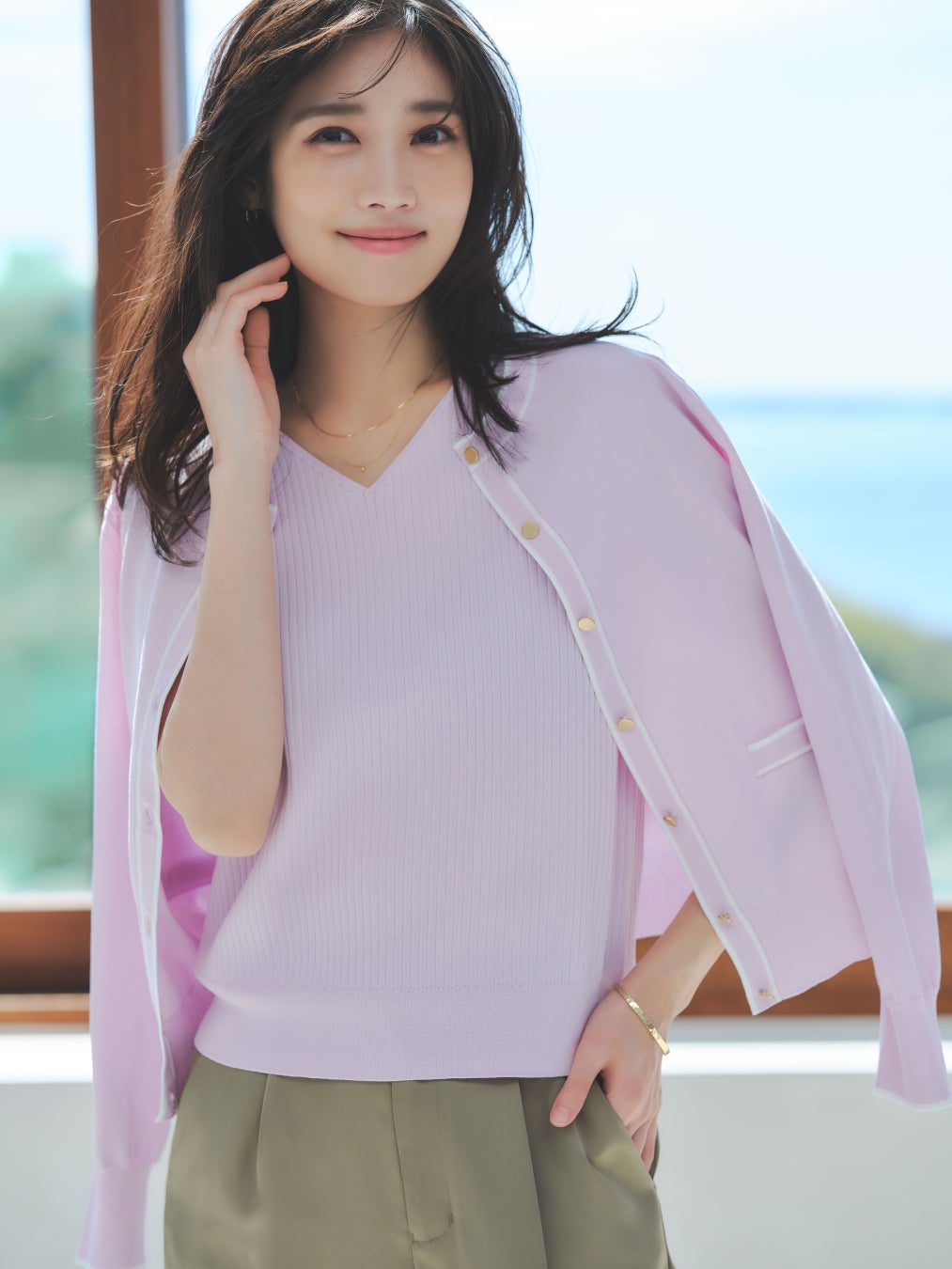 7. ミニマムなニットプルとトリミングが効いた同素材のカーディガンを重ねてアンサンブルに