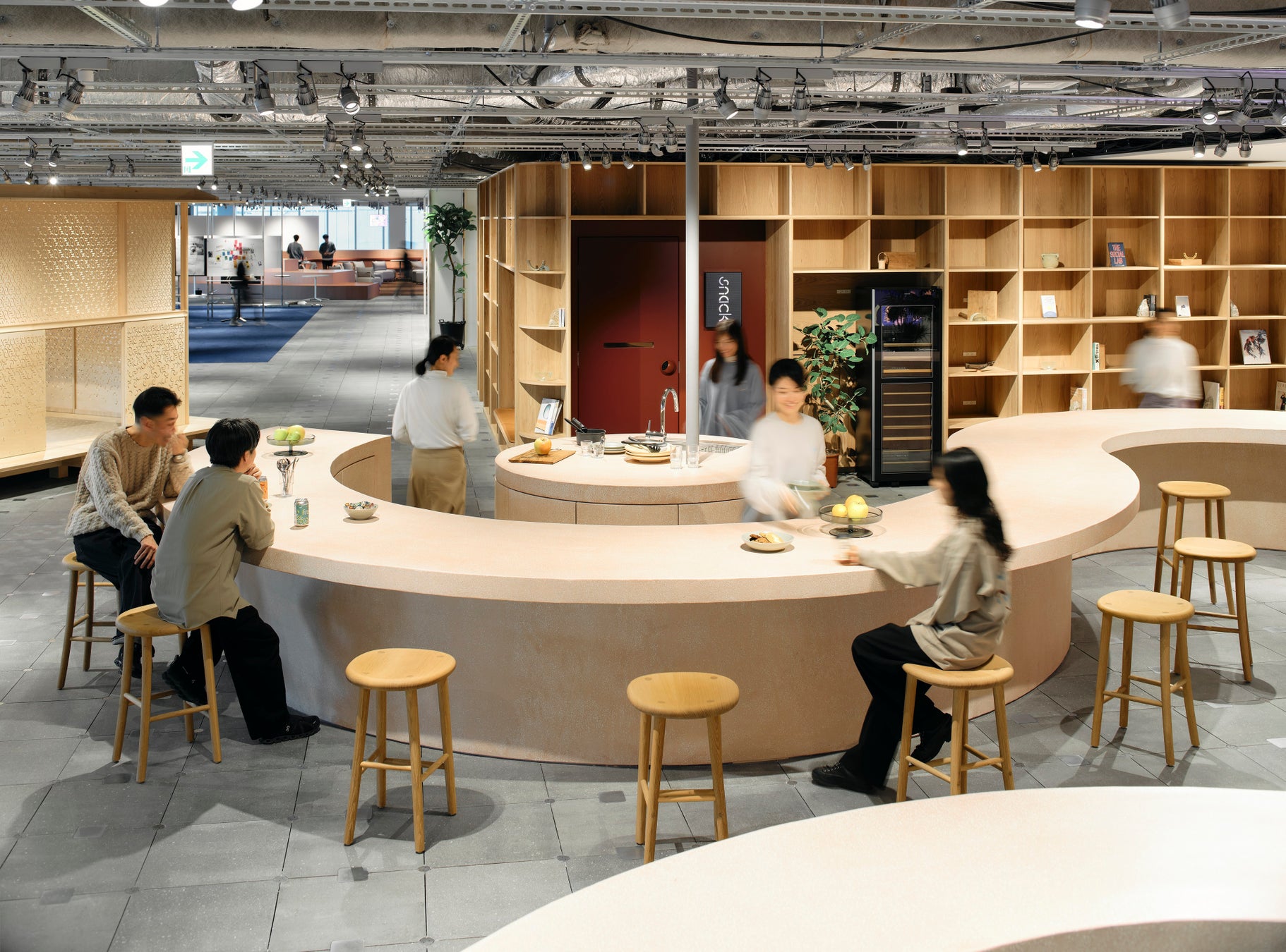 ・交流エリア「yokocho」は、コーヒースタンドやキッチン&カフェ、BARなどが並ぶ路地をイメージ。レイアウトを滑らかな動線とすることで、顧客やパートナーとの偶発的な出会いや会話を誘発