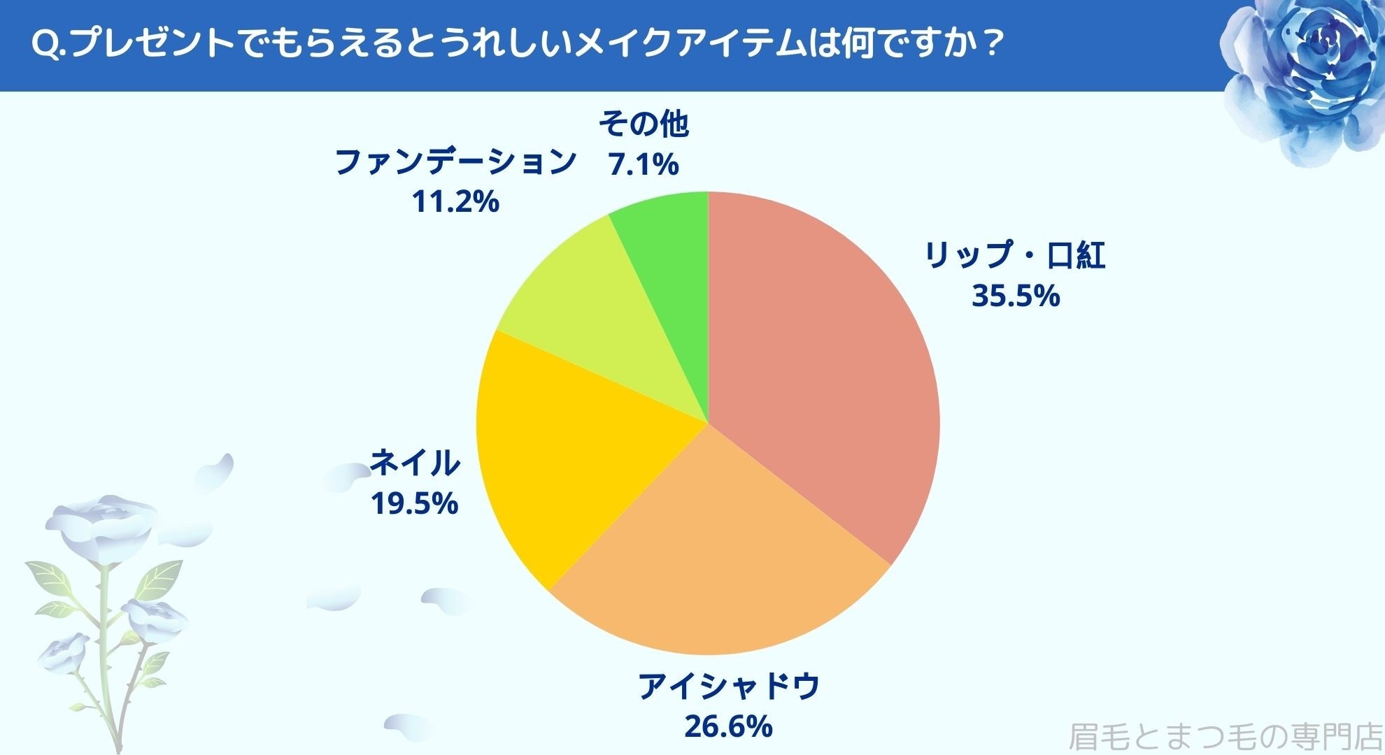 プレゼントでもらえるとうれしいメイクアイテムをお聞きしたところ「リップ・口紅(35.5%)」、「アイシャドウ(26.6%)」、「ネイル(19.5%)」、「ファンデーション(11.2%)」、「その他(7.1%)」という結果になりました。
