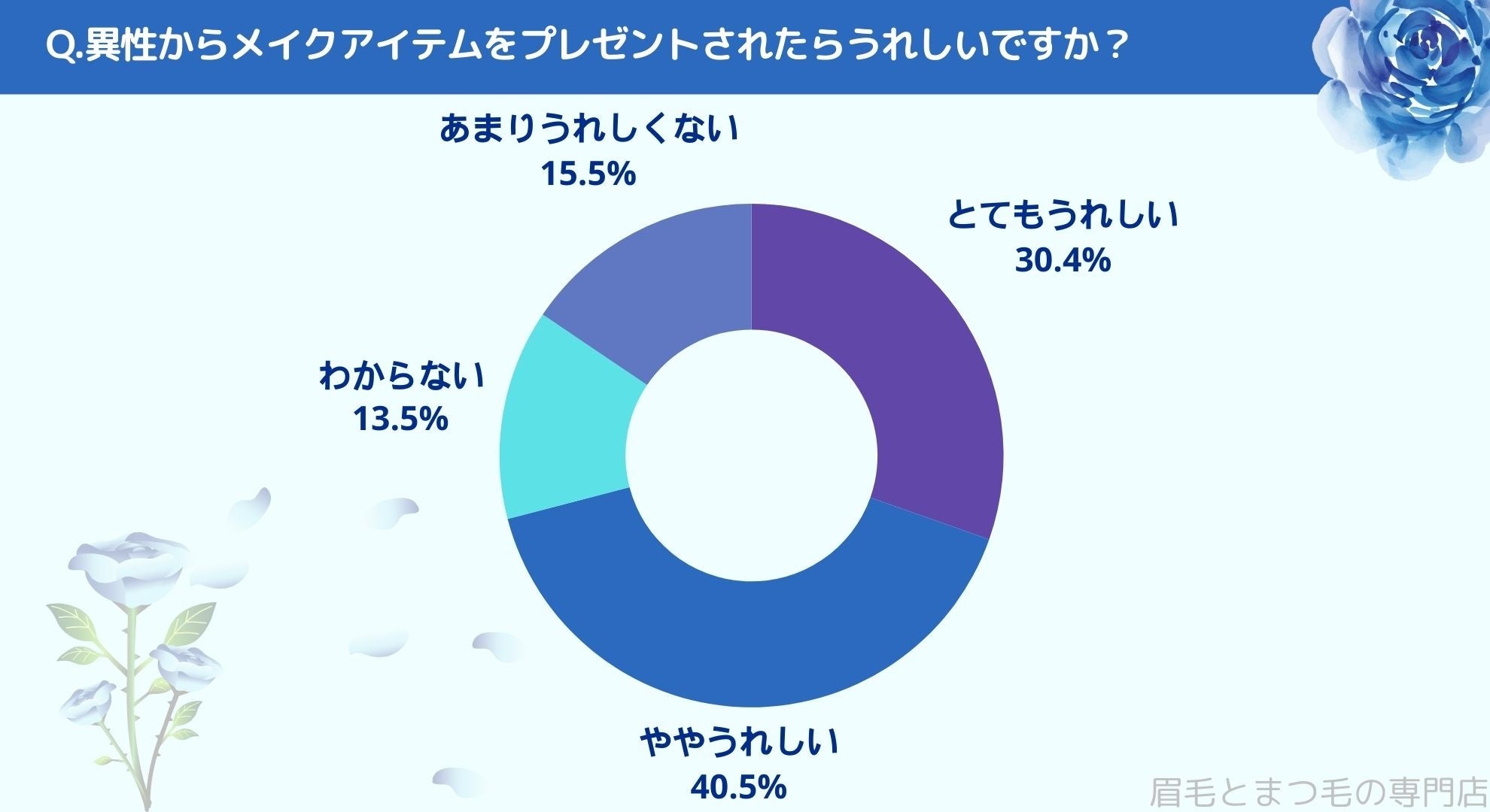 異性からメイクをされたらうれしいかお聞きしたところ「とてもうれしい(30.4%)」、「ややうれしい(40.5%)」、「わからない(13.5%)」、「あまりうれしくない(15.5%)」という結果になりました。