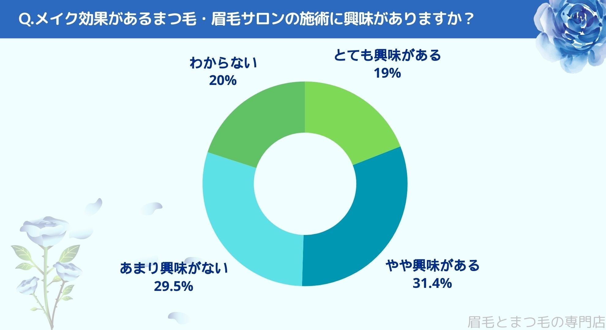 メイク効果があるまつ毛・眉毛サロンの施術に興味があるかお聞きしたところ「とても興味がある(19%)」、「やや興味がある(31.4%)」、「あまり興味がない(29.5%)」、「わからない(20%)」という結果になりました。