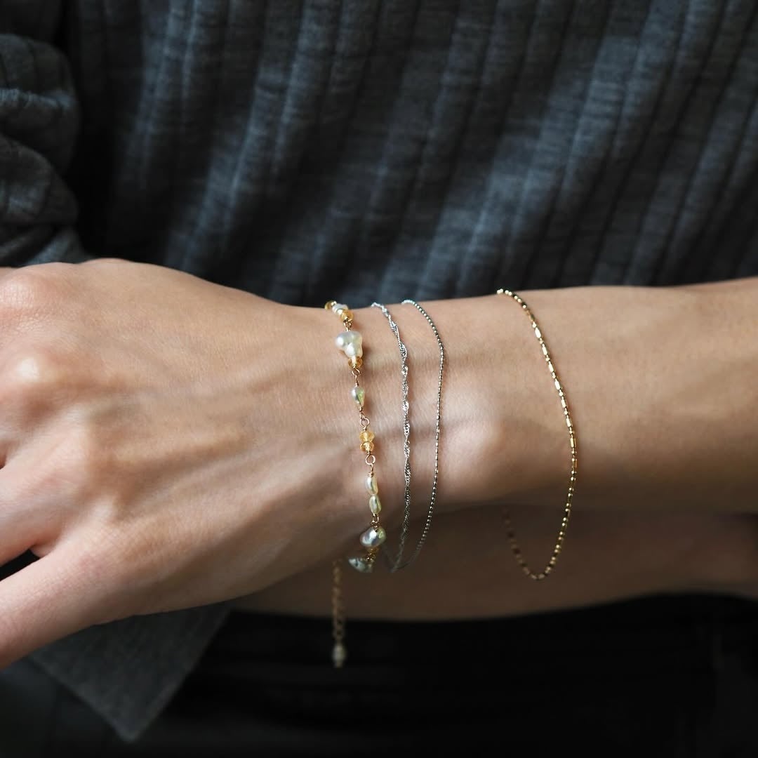 控えめな存在感でありながら、重ねることで光の束が生まれる、洗練の名脇役。「Pomponee(ポンポネ)」や「シャンク巻きブレスレット」との重ねづけもおすすめです。