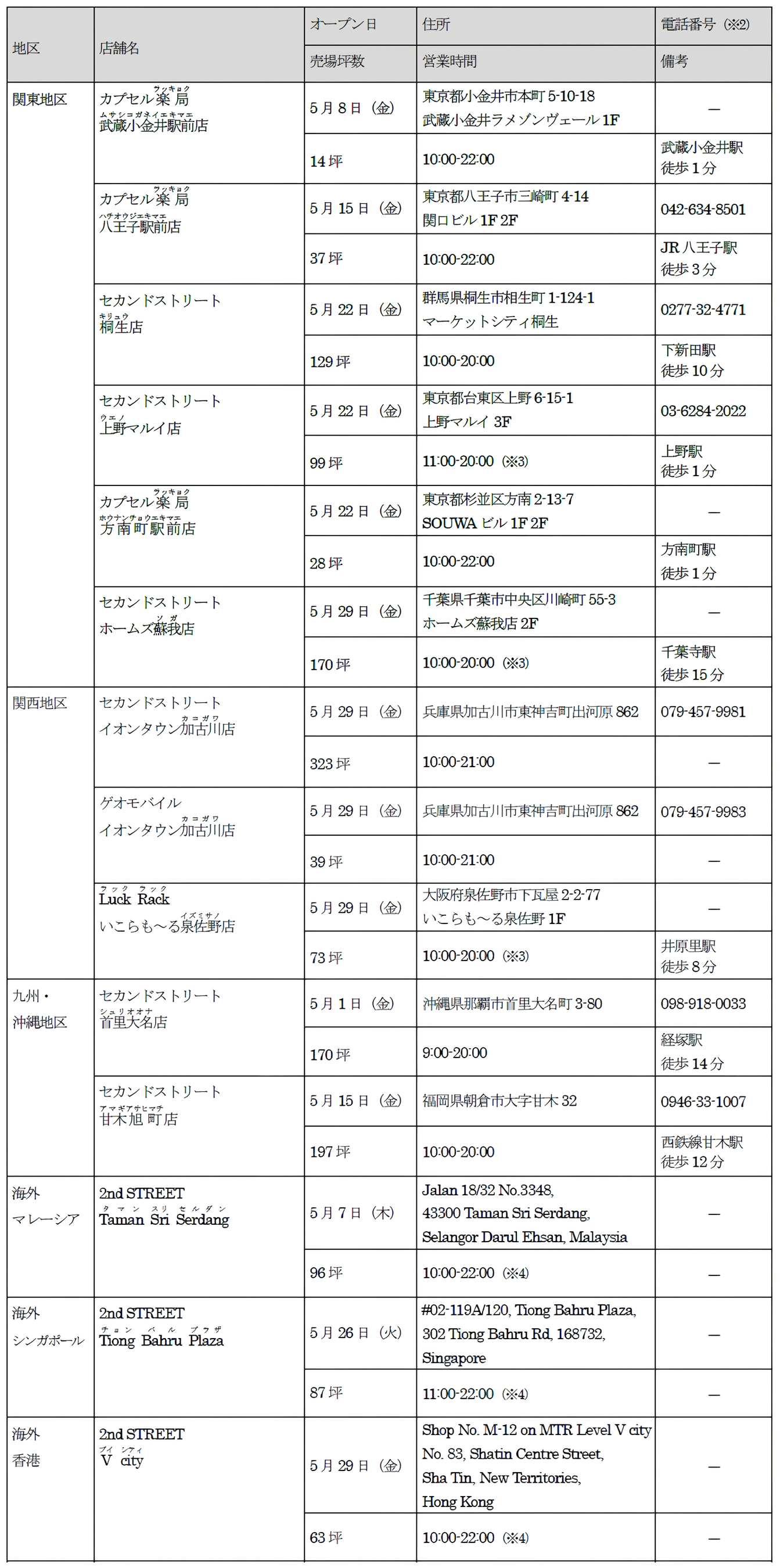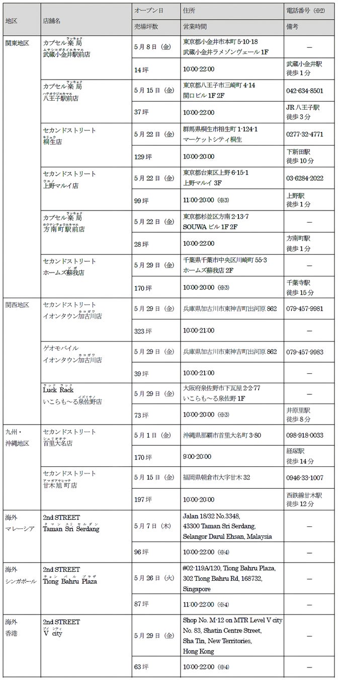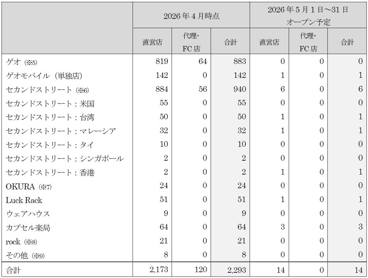 新たに、セカンドストリート9店舗、ゲオモバイル1店舗、ラックラック1店舗、カプセル楽局3店舗の合計14店舗が2026年5月にオープンします。