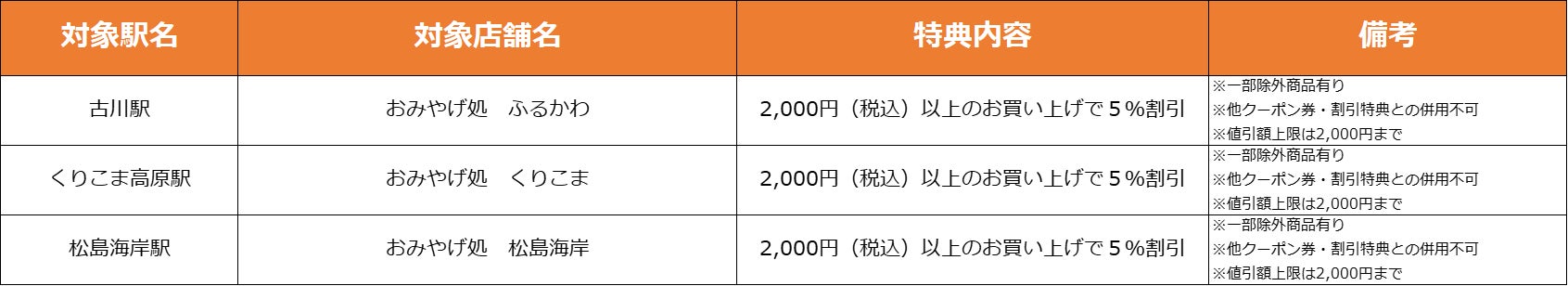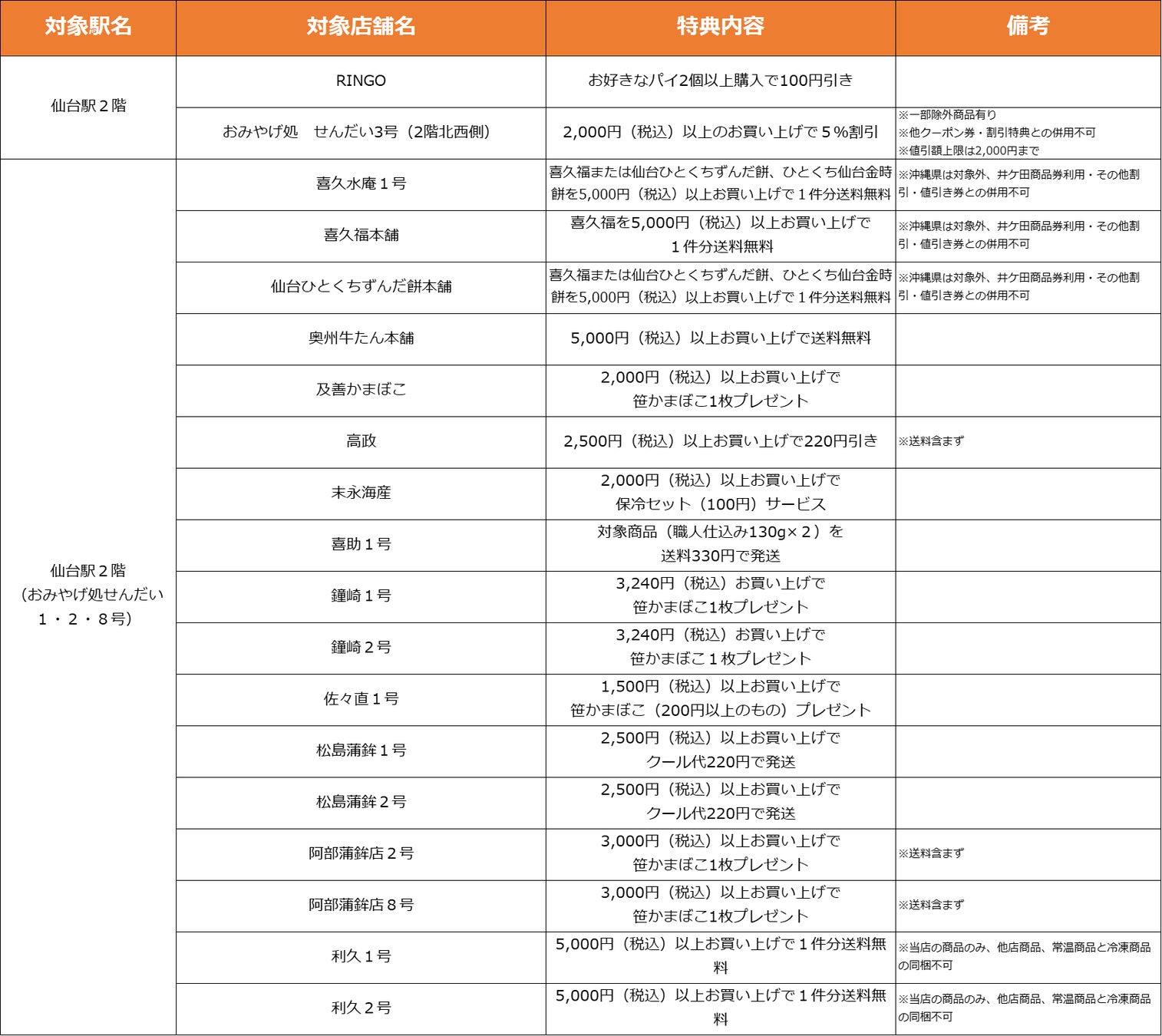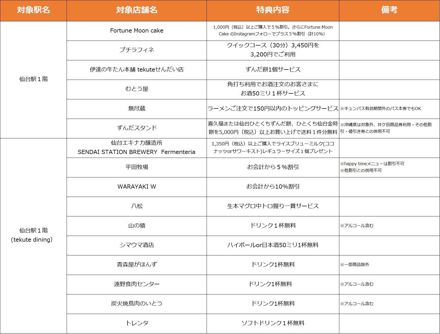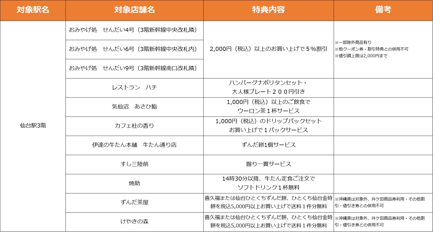 【仙台駅3F】特典対象店舗・特典内容