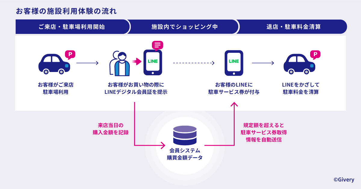 図の通り、既存のLINE公式アカウント上のデジタル会員証システムと連携することで、お客様は今まで通り施設内で買い物をするだけで駐車サービス券を受け取ることができます。